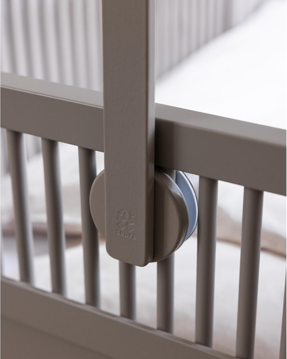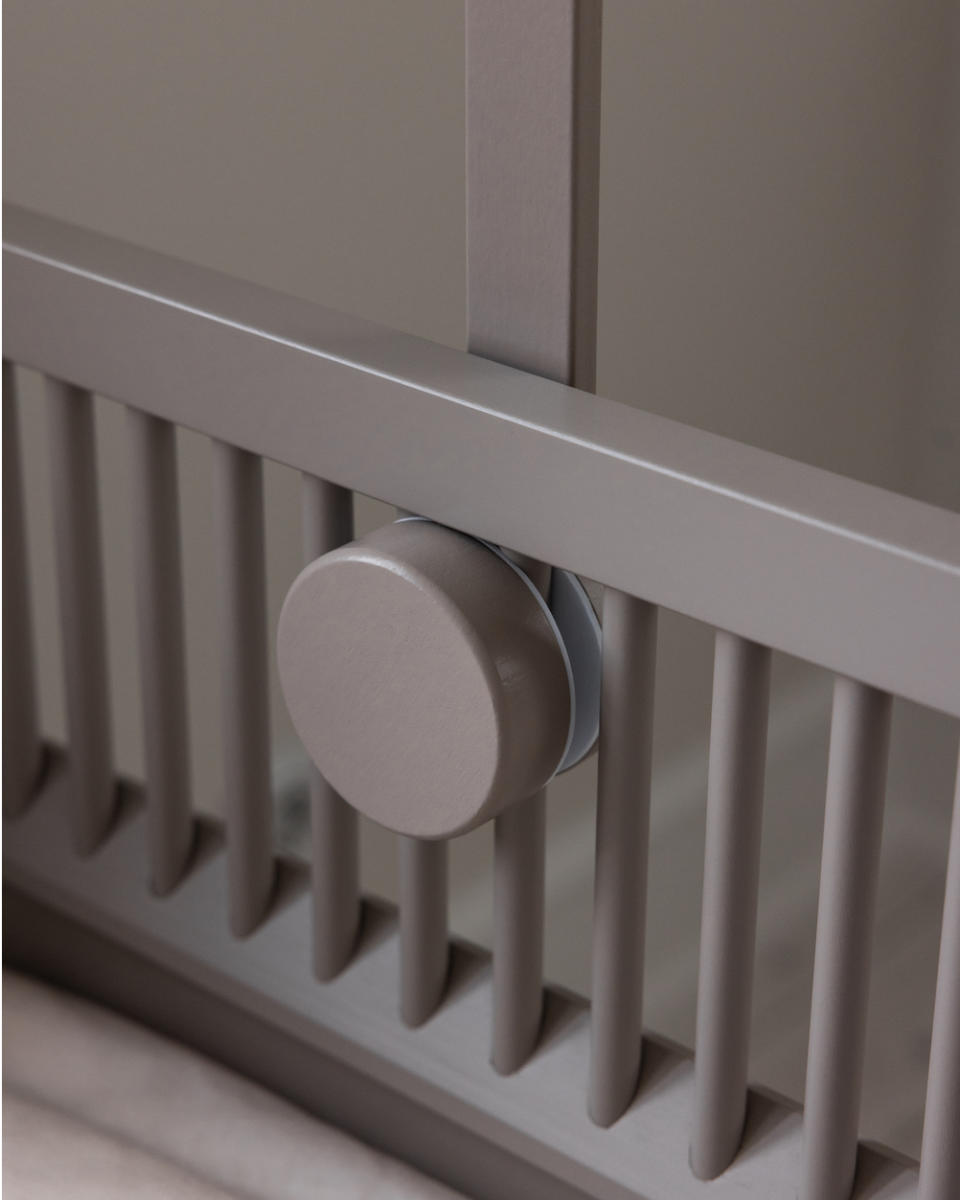Die Befestigung ist besonders benutzerfreundlich: Der Halter wird mit wenigen Handgriffen zwischen den Gitterstäben des Sebra Junior & Grow Bettes oder nahezu jedes anderen Gitterbettes fixiert. Ein durchdachtes Detail sind die gepolsterten Scheiben an den Befestigungspunkten. Sie gewährleisten einen sicheren Halt und schützen gleichzeitig das Bettgestell vor Kratzern und Druckstellen.