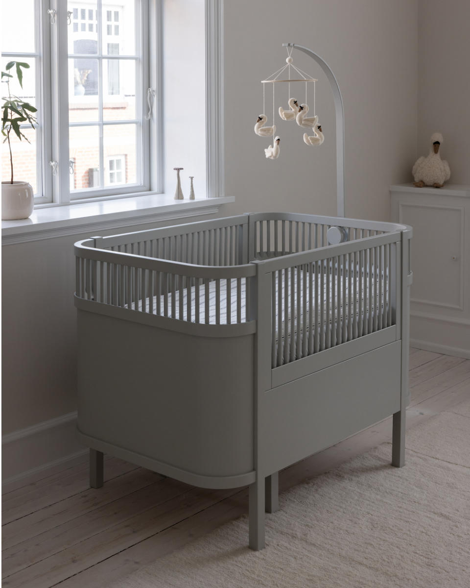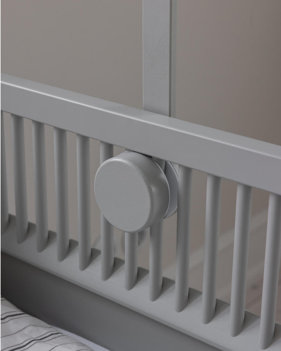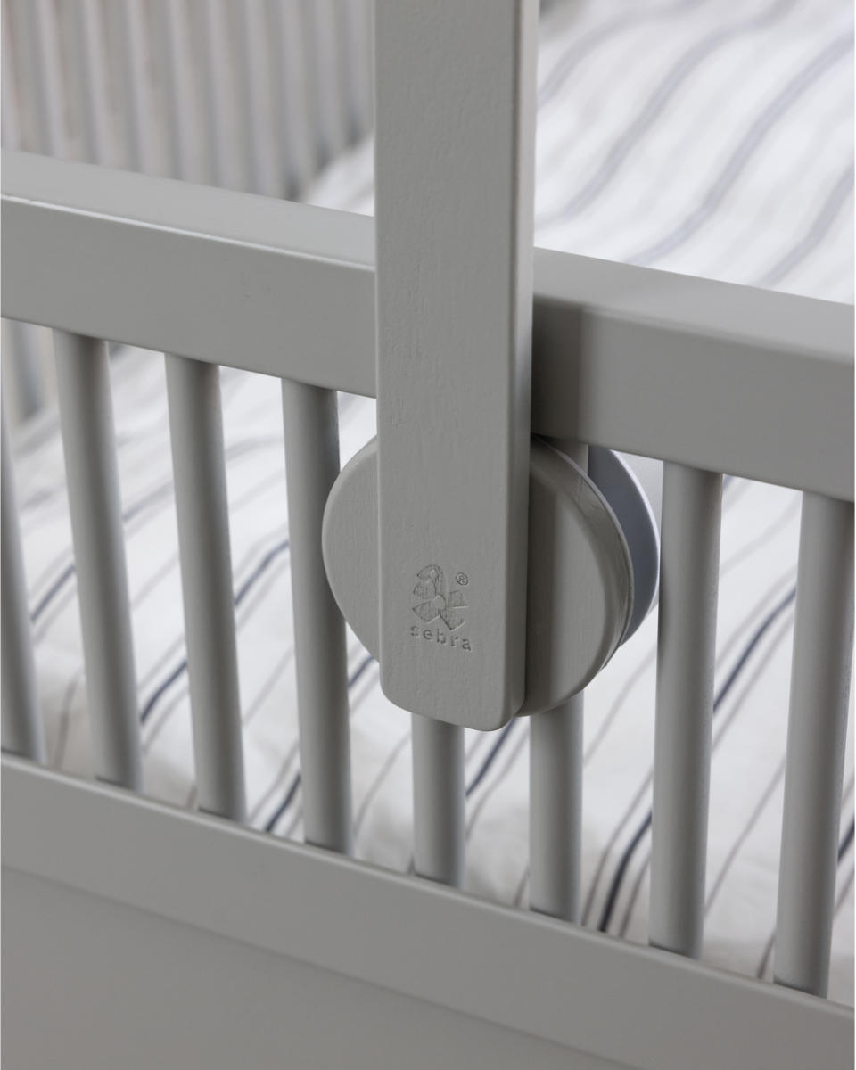 Die Befestigung ist besonders benutzerfreundlich: Der Halter wird mit wenigen Handgriffen zwischen den Gitterstäben des Sebra Junior & Grow Bettes oder nahezu jedes anderen Gitterbettes fixiert. Ein durchdachtes Detail sind die gepolsterten Scheiben an den Befestigungspunkten. Sie gewährleisten einen sicheren Halt und schützen gleichzeitig das Bettgestell vor Kratzern und Druckstellen.