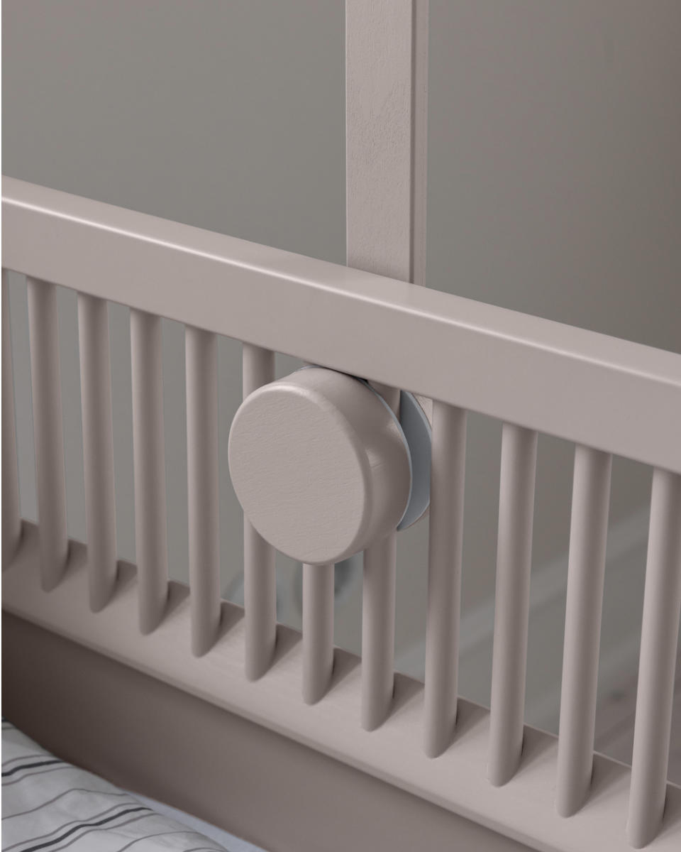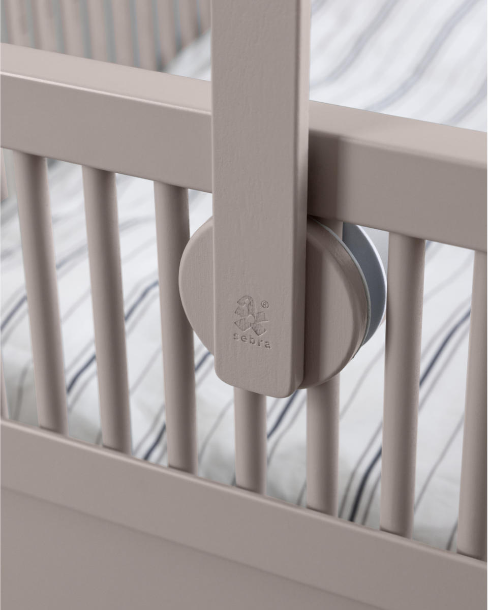 Die Befestigung ist besonders benutzerfreundlich: Der Halter wird mit wenigen Handgriffen zwischen den Gitterstäben des Sebra Junior & Grow Bettes oder nahezu jedes anderen Gitterbettes fixiert. Ein durchdachtes Detail sind die gepolsterten Scheiben an den Befestigungspunkten. Sie gewährleisten einen sicheren Halt und schützen gleichzeitig das Bettgestell vor Kratzern und Druckstellen.