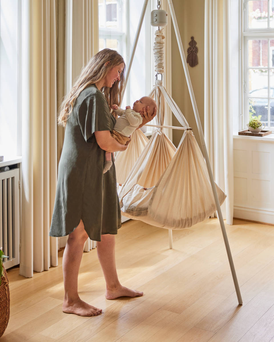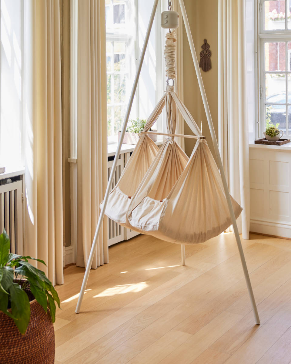 Das Gestell wurde gezielt für die Traglast und die Bewegungen einer Zwillingswiege entwickelt. Der Aufbau ist kippsicher sowie extrem belastbar.