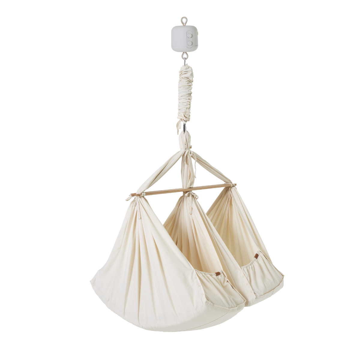 Die Zwillings-Federwiege ist derart konzipiert, dass beide Kinder ausreichend Platz besitzen, jedoch trotzdem die lindernde Nähe des anderen spüren. Die gleichzeitige Bewegung des Antriebs sorgt dafür, dass beide im selben Moment behutsam gewiegt werden.