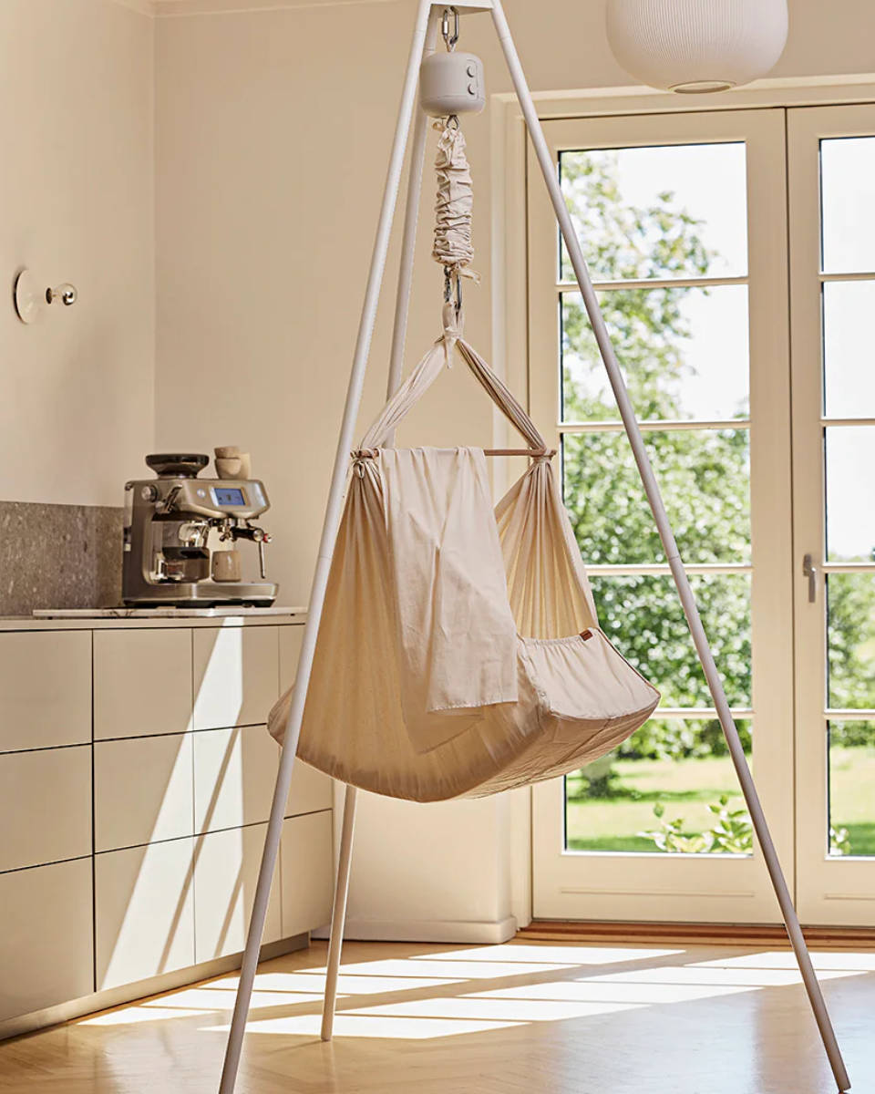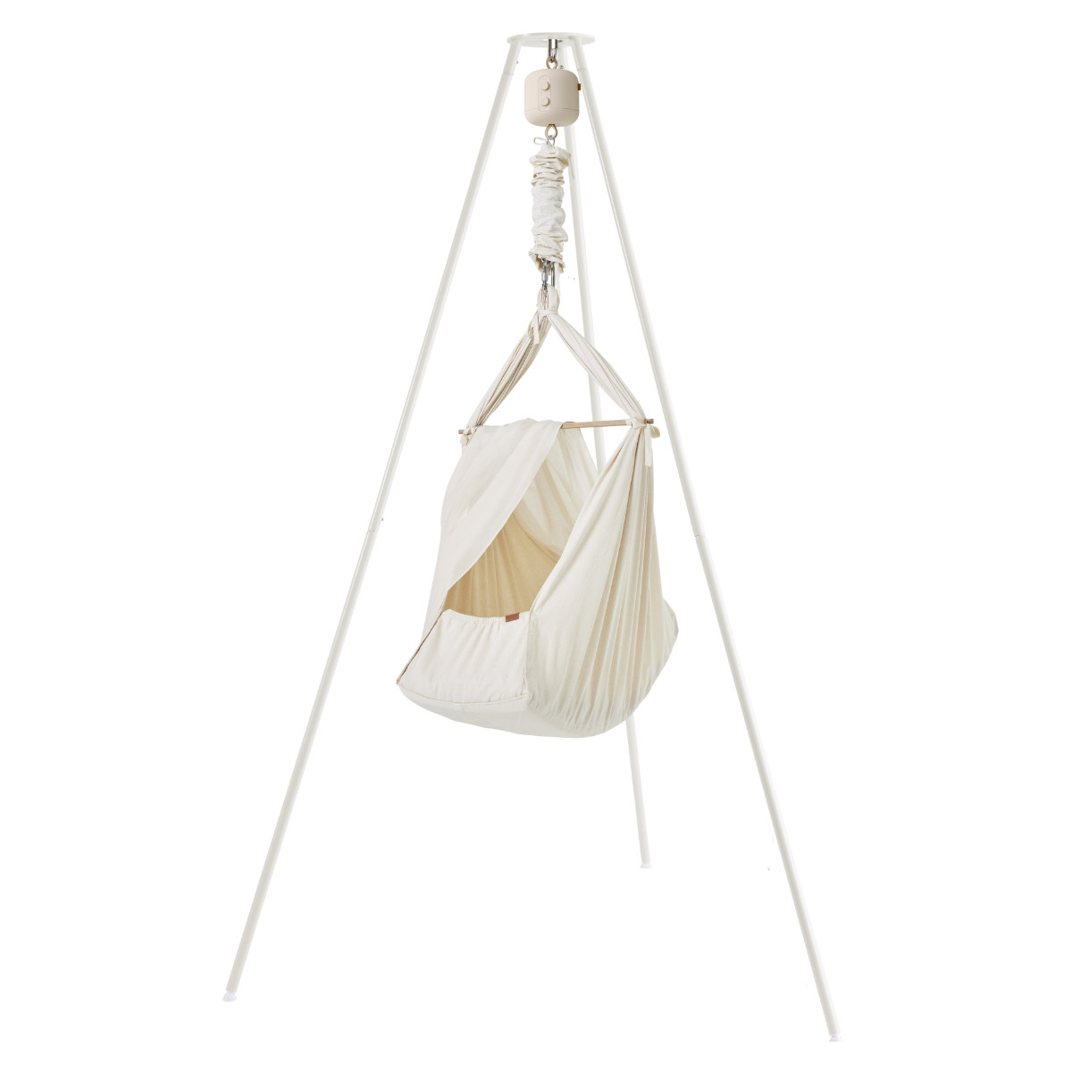 Das weiße Gestell wurde gezielt für den Einsatz mit motorisierten Federwiegen entworfen. Es ist standfest, kippsicher und besticht durch eine elegante Optik. Da keinerlei Deckenmontage nötig ist, bleibst du vollkommen ungebunden. Ob im Wohnbereich, im Schlafzimmer oder auf Reisen – dein Baby hat seinen gewohnten Schlafplatz stets dabei.