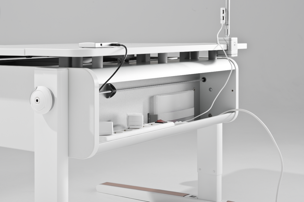 - Kabelkanal auf der Tischrückseite zum Verstauen vom Kabeln und Steckern (hier finden Sie auch die Farbbox)
