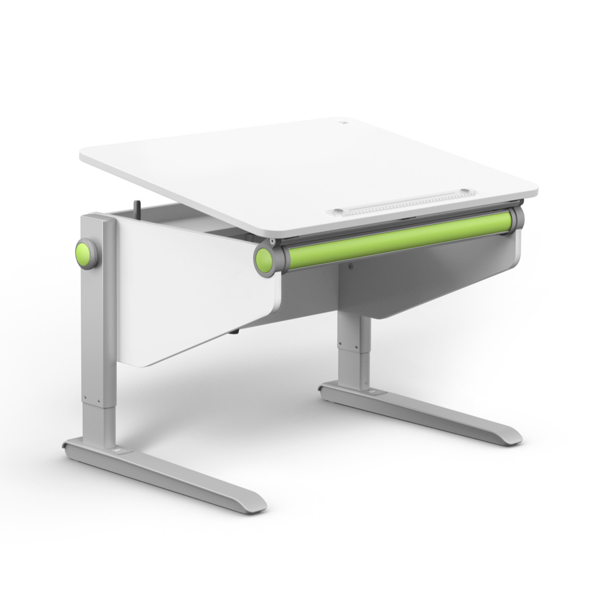 Außerdem kann das Jojo jederzeit abgenommen und separat verstaut werden. Inklusive Buchstütze, Taschenhaken und der Abrutschsperre. Die Seitenteile haben eine modernisierte Form und die Kunststoffelemente in modernem, hellem Grau. Die vorderen Ecken der Tischplatte haben ergonomisch gerundete Kanten und verhindern, dass sich die Kinder an der Tischecke stoßen können.
