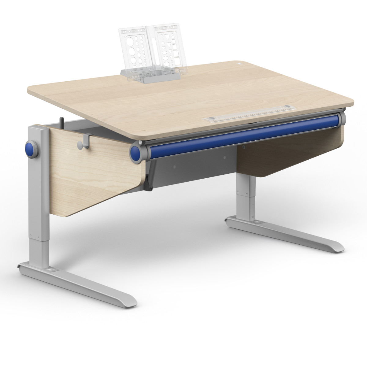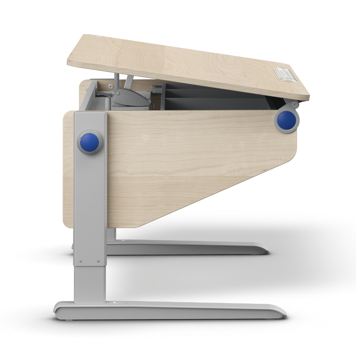 Der Tisch lässt sich stufenlos von 53 bis 82 cm in der Höhe verstellen und wächst mit dir mit. Die Platte ist neigbar (optional geteilt), damit du immer ergonomisch sitzt – egal ob du malst, schreibst oder liest. Alle Ecken sind abgerundet, die Sicherheitsmechanik sorgt für eine sanfte Absenkung.