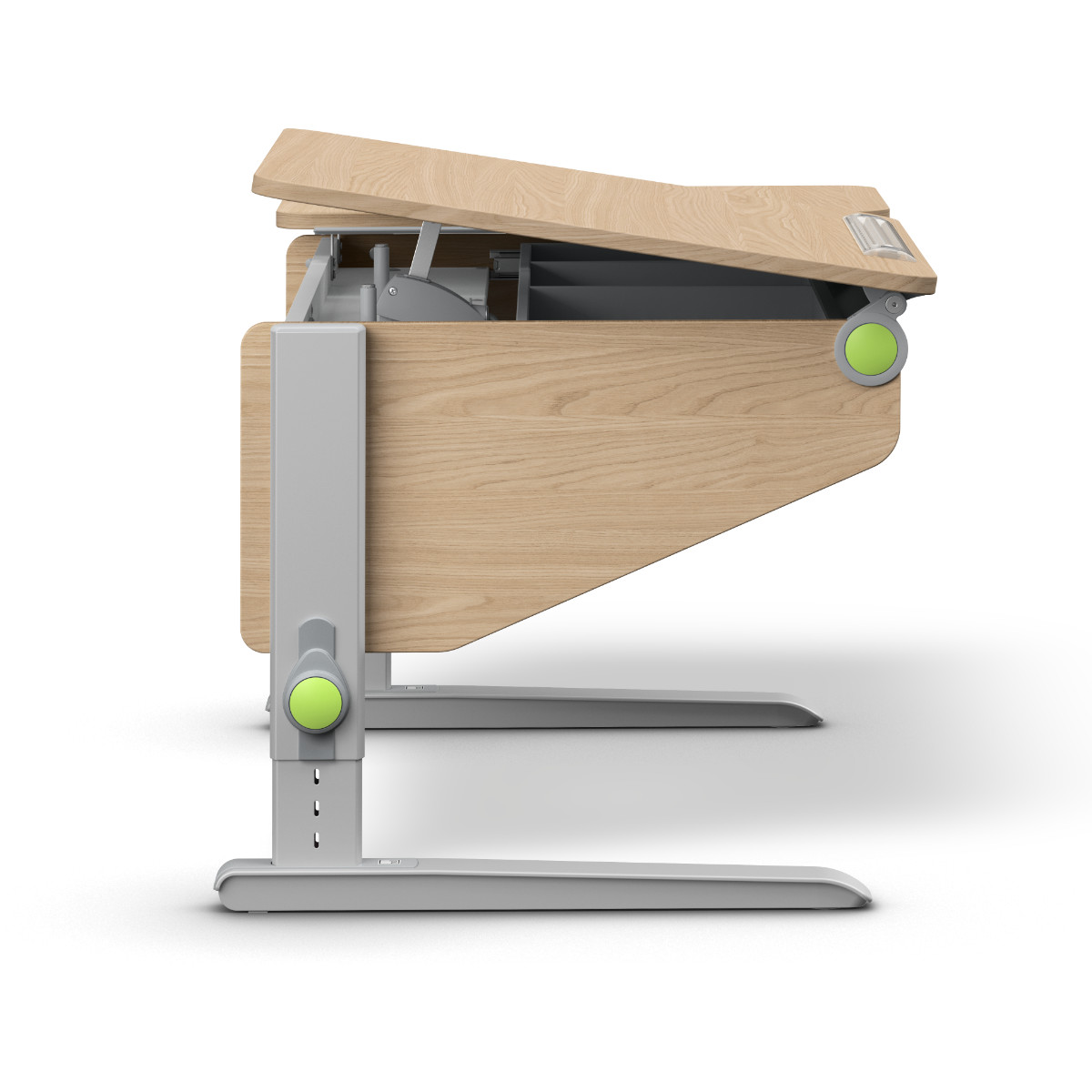 Die Seitenteile haben eine modernisierte Form und die Kunststoffelemente in modernem, hellem Grau. Die vorderen Ecken der Tischplatte haben ergonomisch gerundete Kanten und verhindern, dass sich die Kinder an der Tischecke stoßen können.