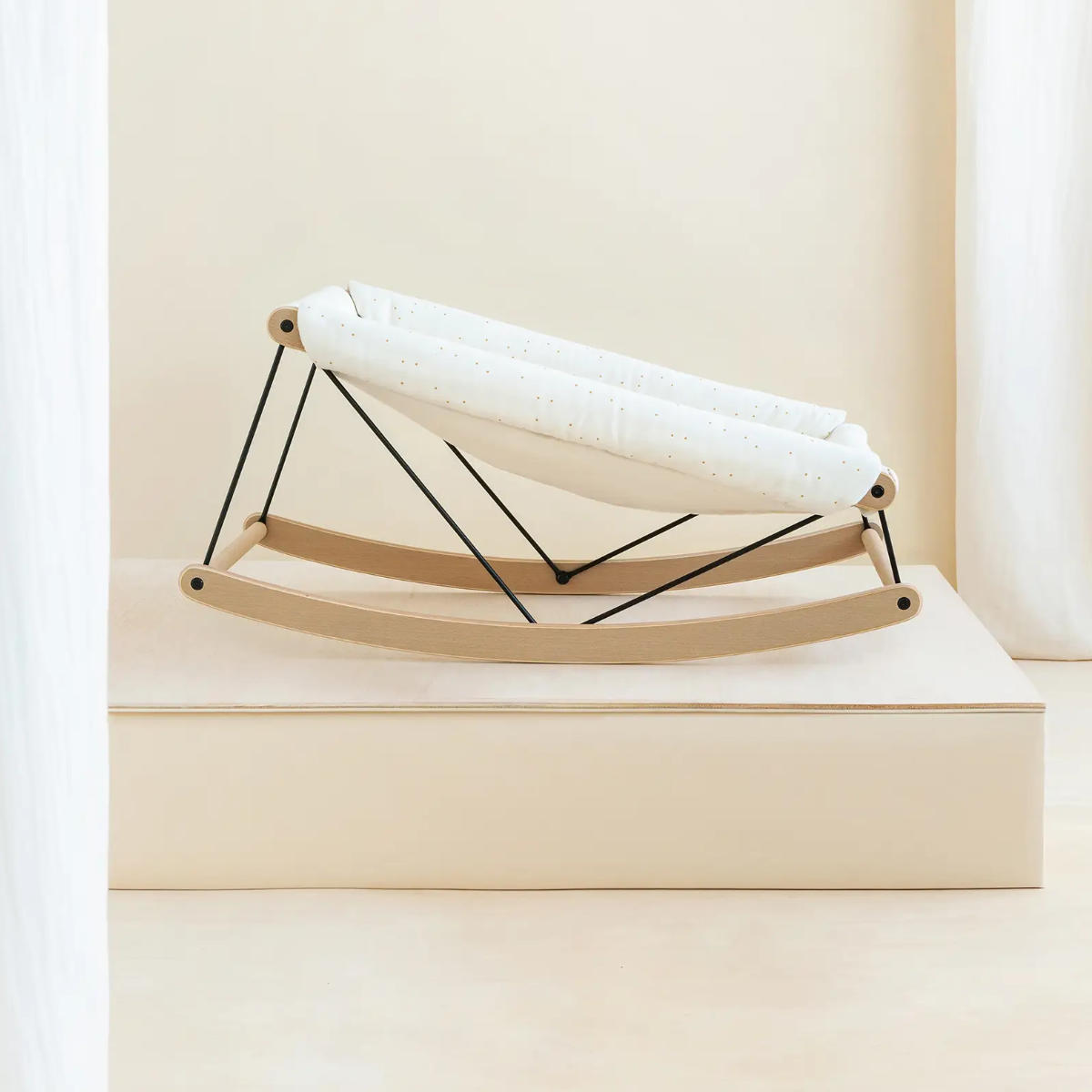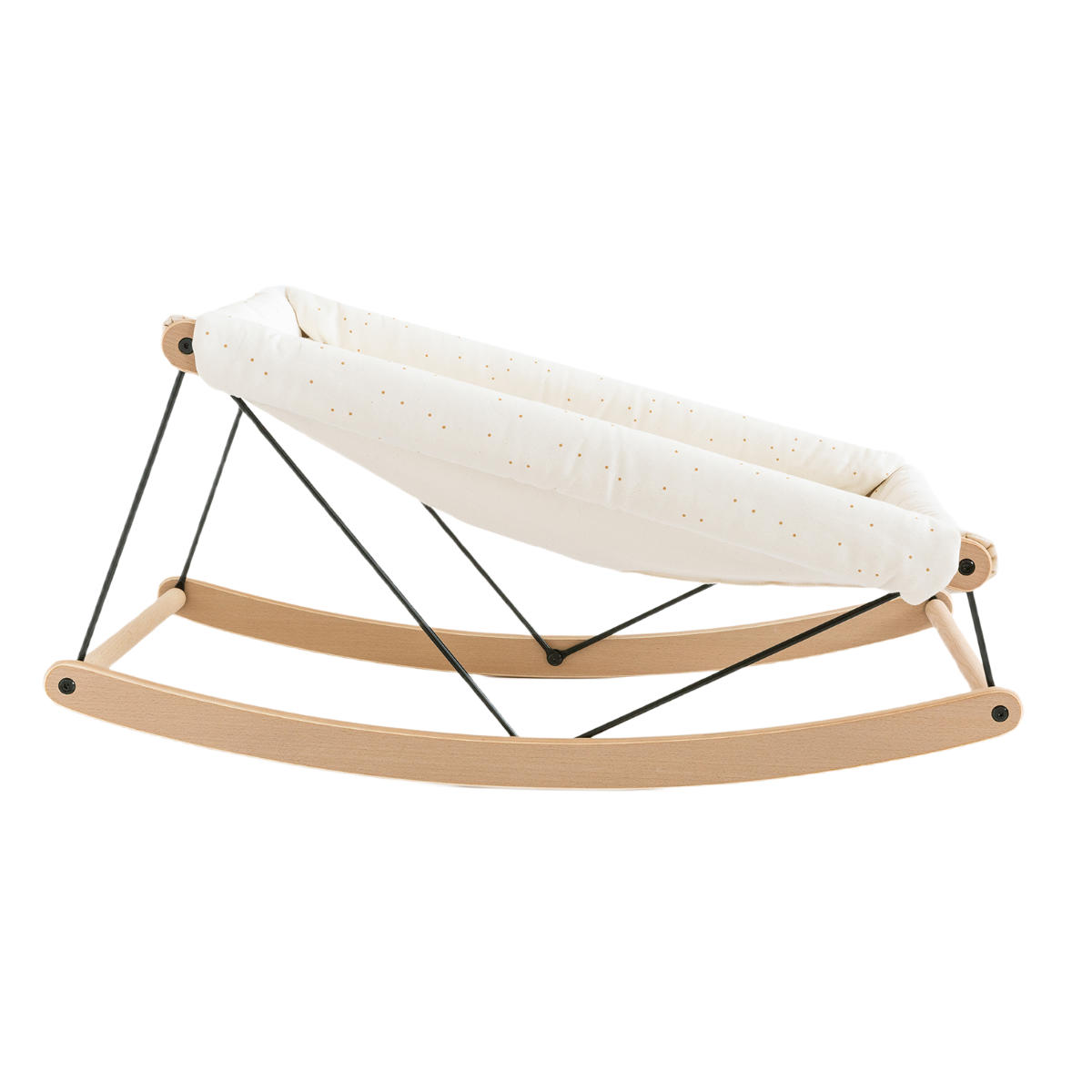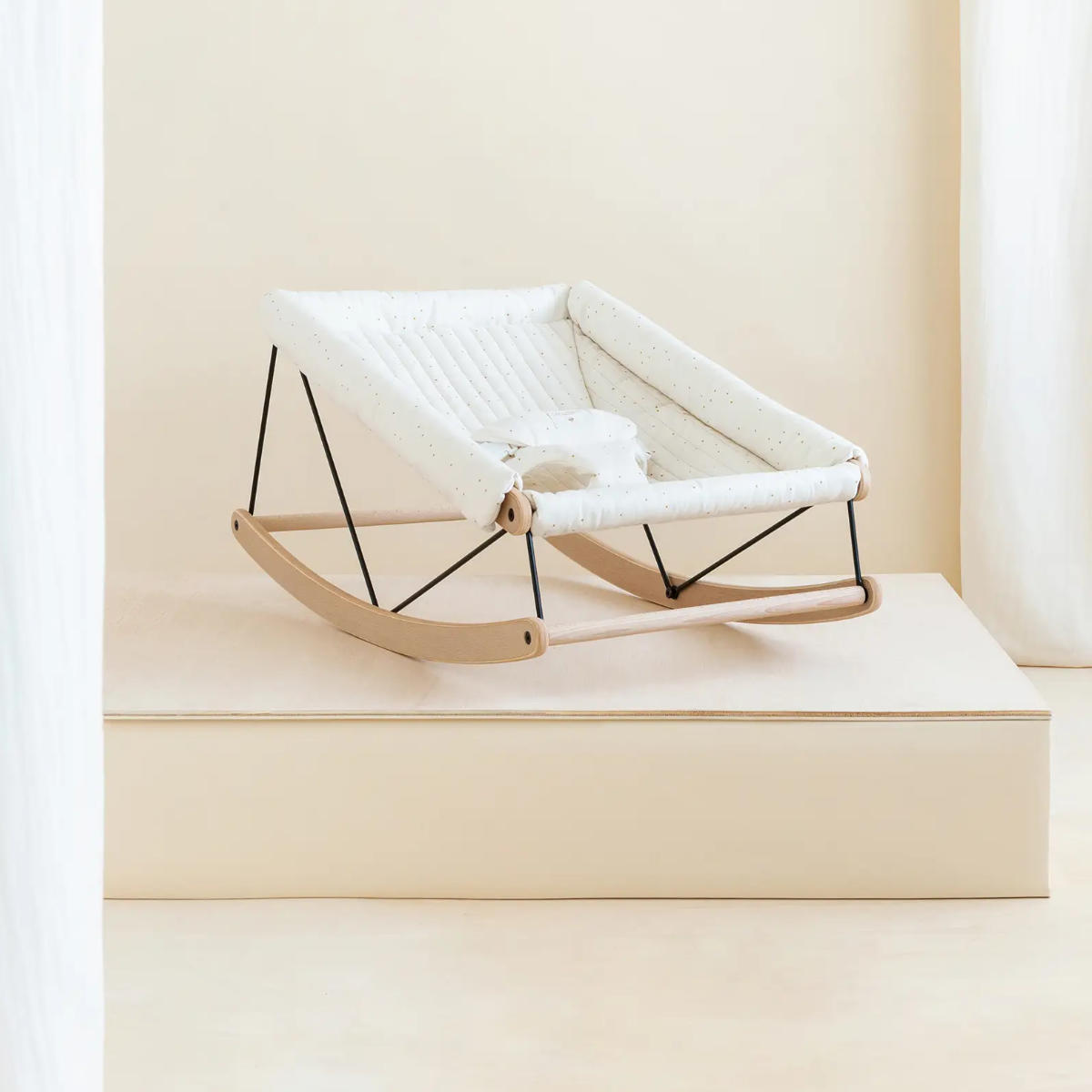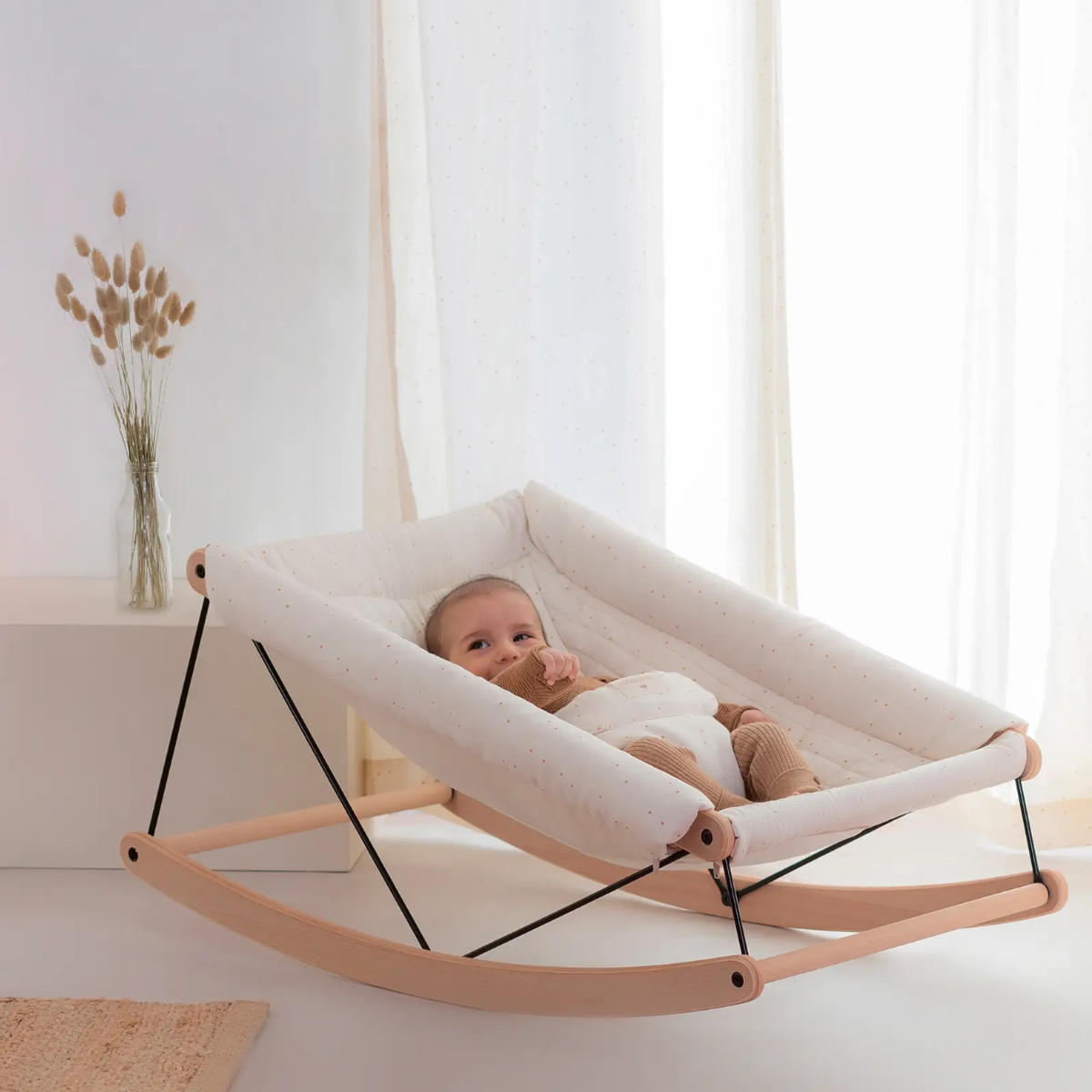 Aus rein natürlichen Materialien gefertigt, wie Buchenholz in mattem Finish und Bio-Baumwolle, bietet sie Stabilität und ausreichend Platz. Sie schenkt deinem Baby bis zu einem Gewicht von 9kg Sicherheit und Komfort.
