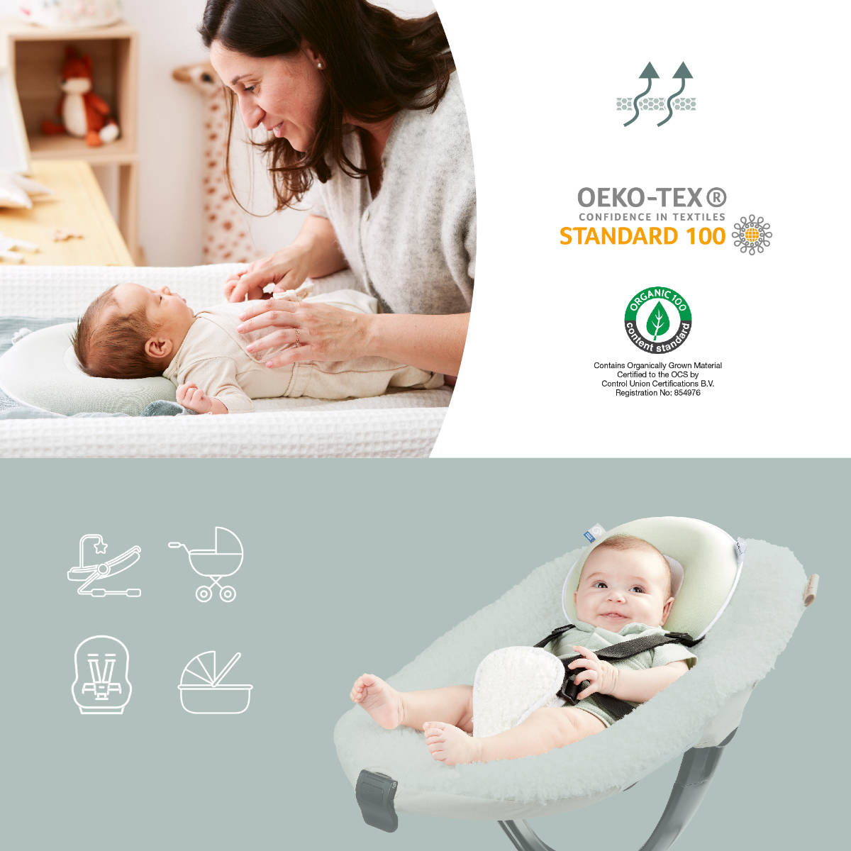 Ob zu Hause oder unterwegs – das kompakte Design passt in jede Wippe, Babyschale oder Kinderwagen. Der rutschfeste Rücken sorgt dabei für einen sicheren Halt.
