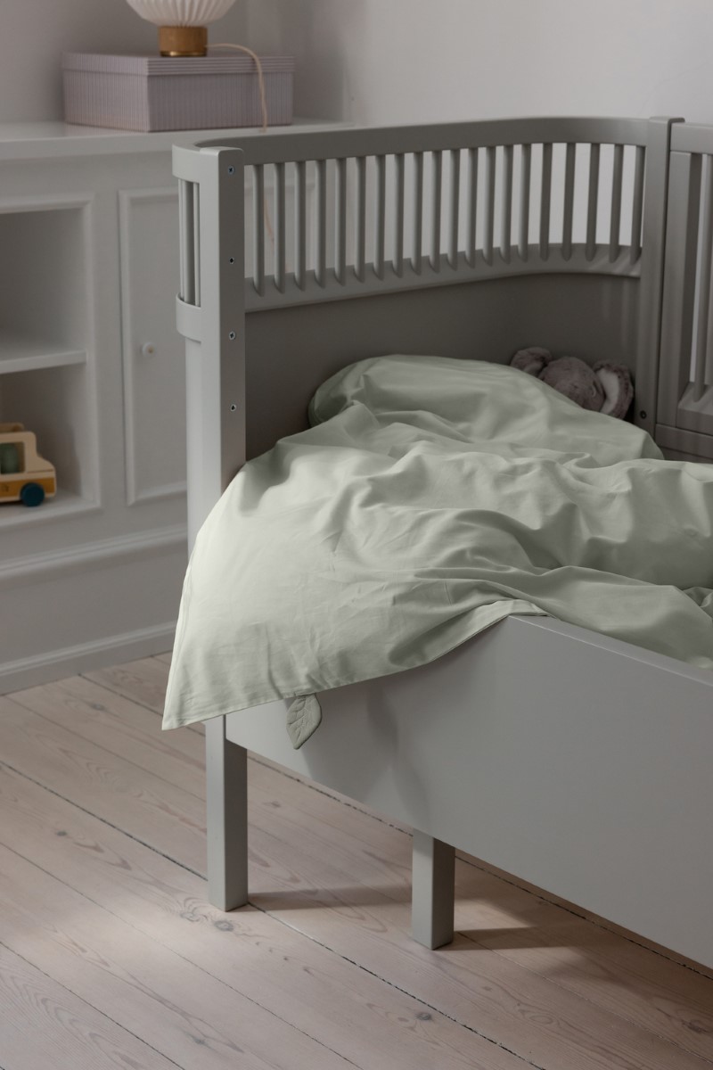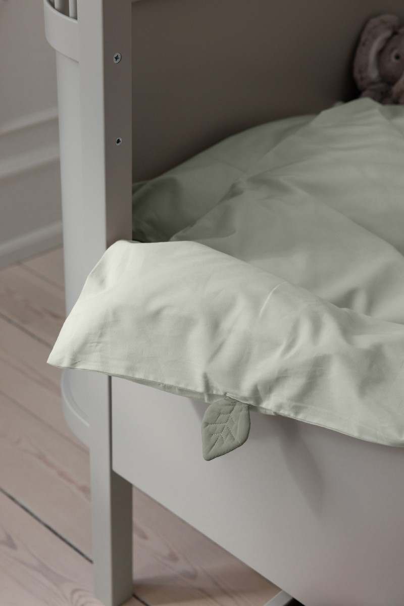 Die beiden Bezüge – einer für die Decke, einer für das Kissen – verfügen über verdeckte YKK-Reißverschlüsse, damit nichts beim Schlafen stört. Ein liebevolles Extra ist die kleine Blätterlasche am Deckenbezug, die als beruhigendes Element für müde Finger dienen kann.