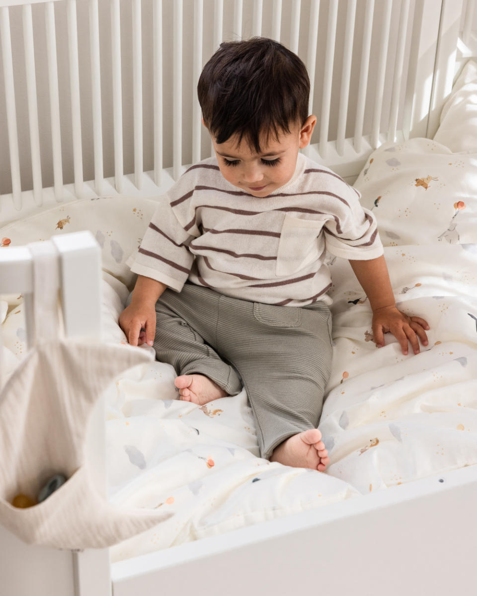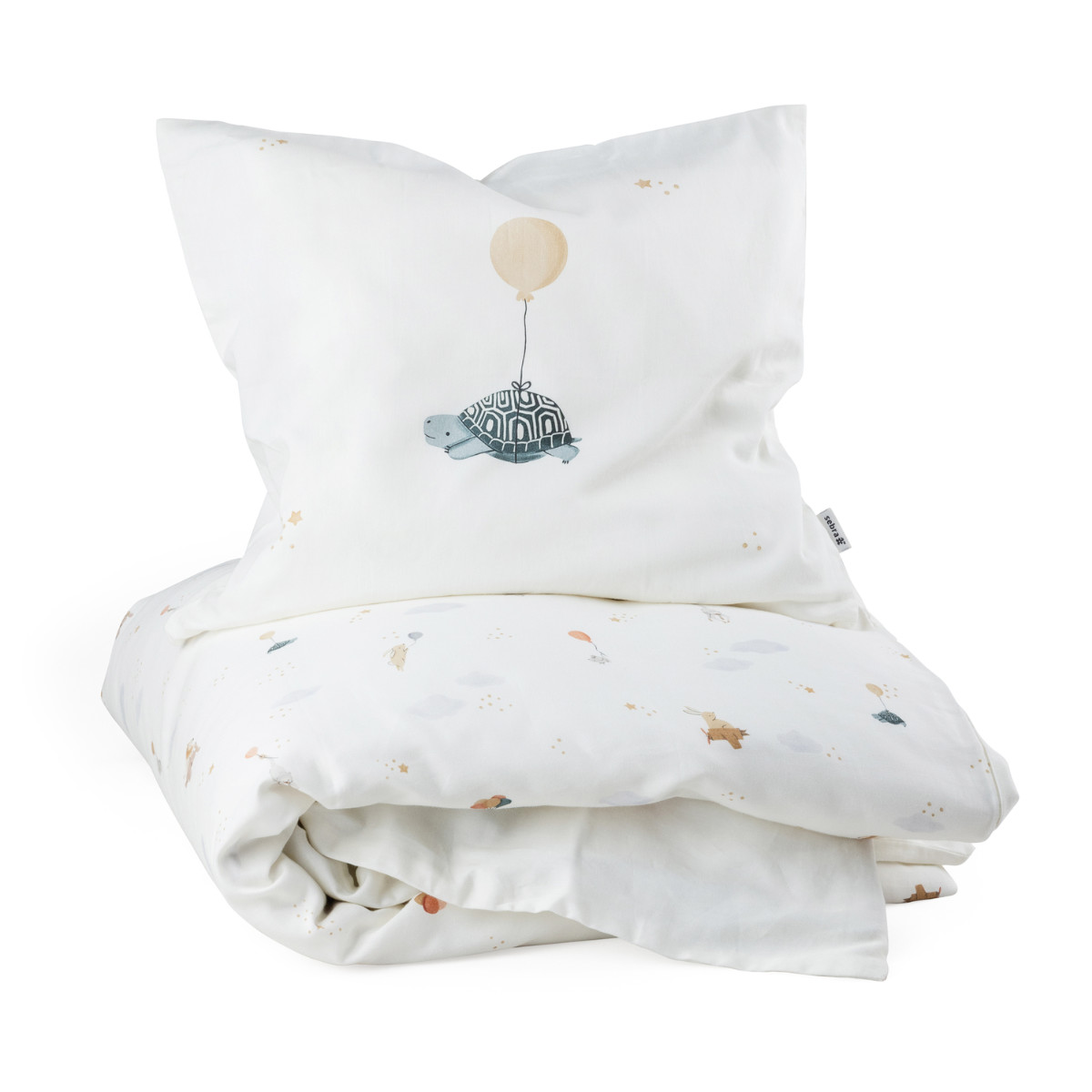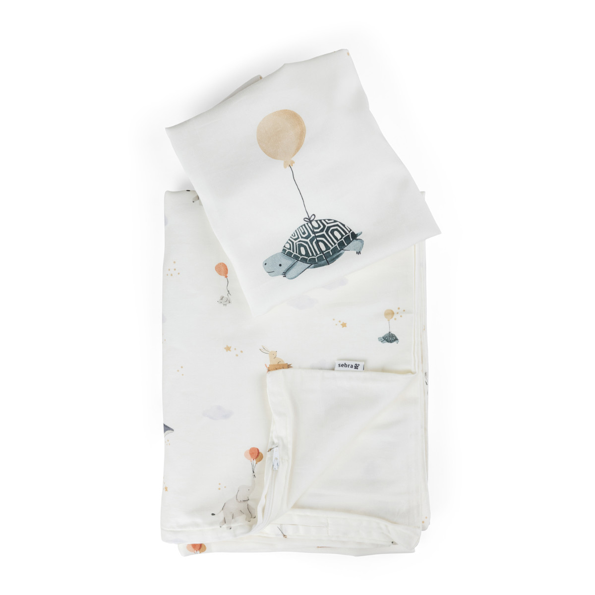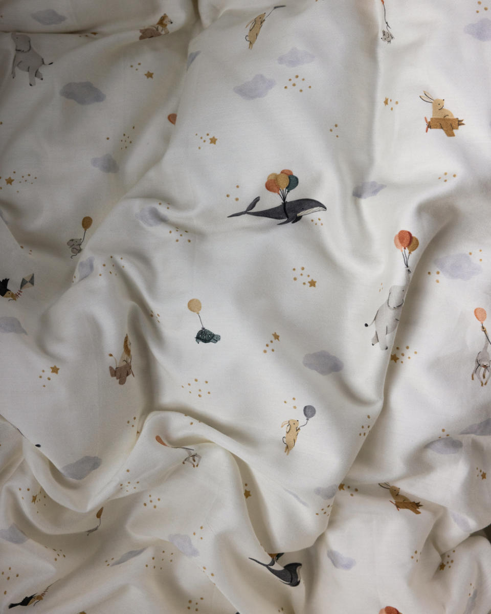 Die beiden Bezüge – einer für die Decke, einer für das Kissen – verfügen über verdeckte YKK-Reißverschlüsse, damit nichts beim Schlafen stört. Ein liebevolles Extra ist die kleine Blätterlasche am Deckenbezug, die als beruhigendes Element für müde Finger dienen kann.