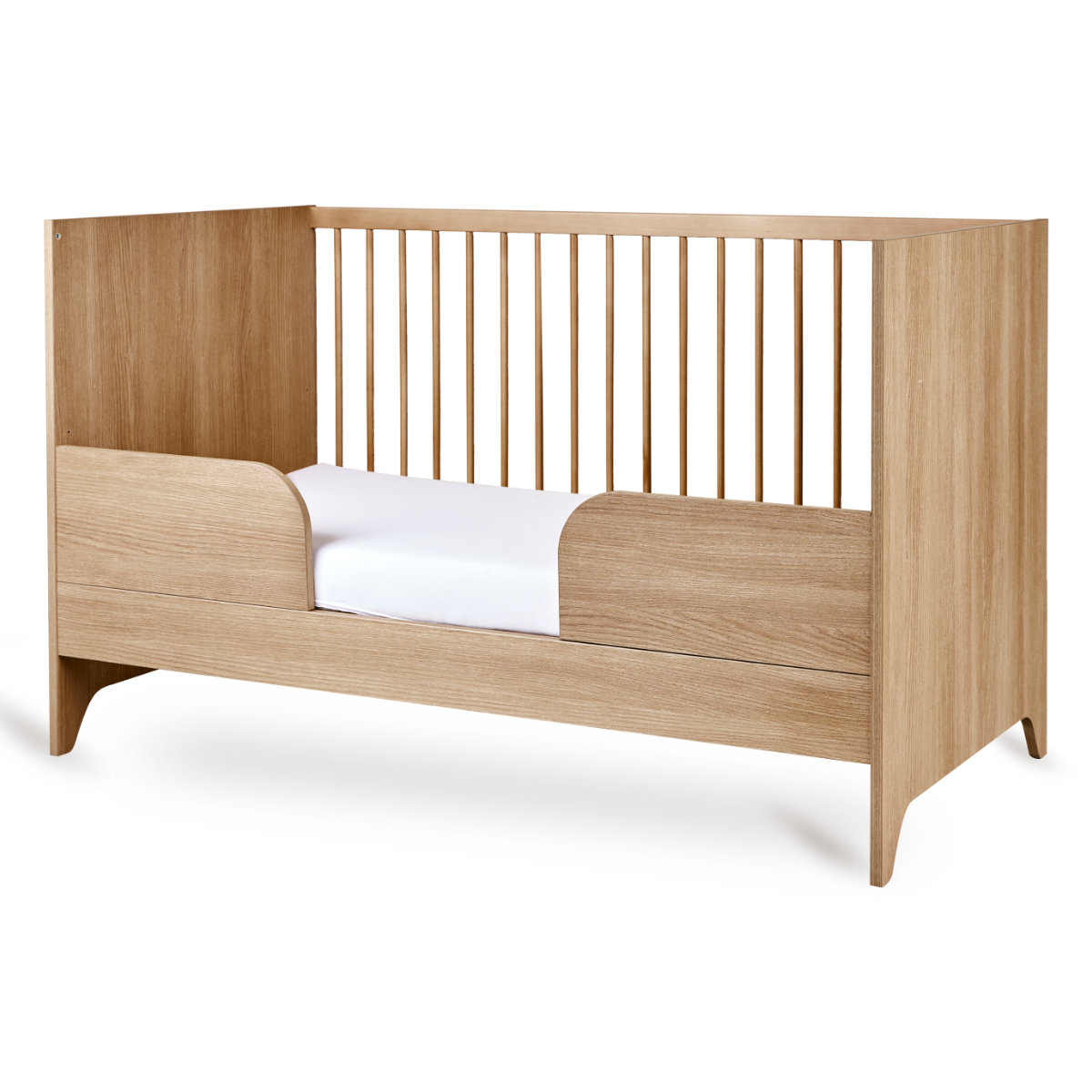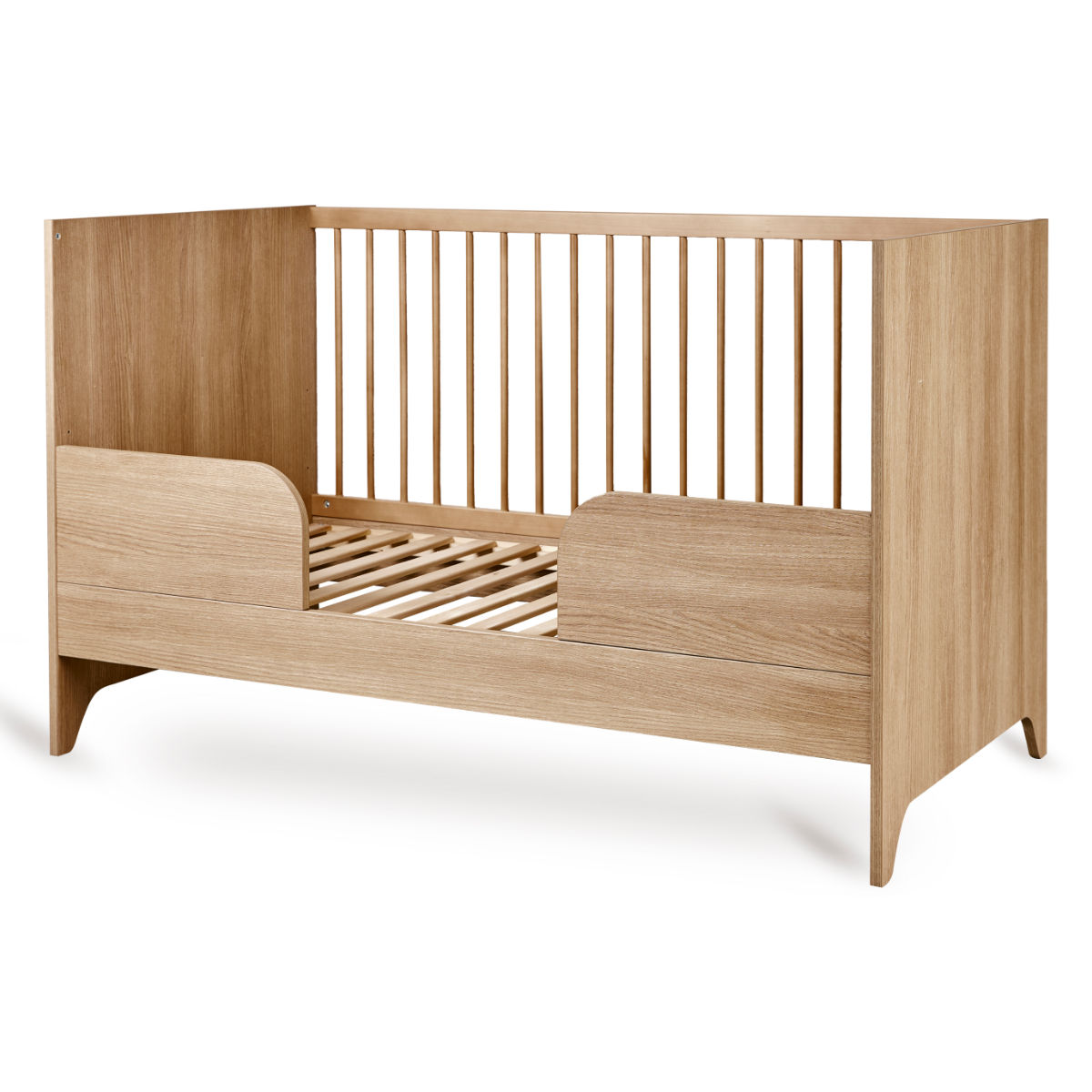 Die größere Version wächst ebenfalls mit und wird zu einem komfortablen Kinderbett, das dein Kind bis etwa 6 Jahre begleitet. Die passende Absturzsicherung ist bereits enthalten.