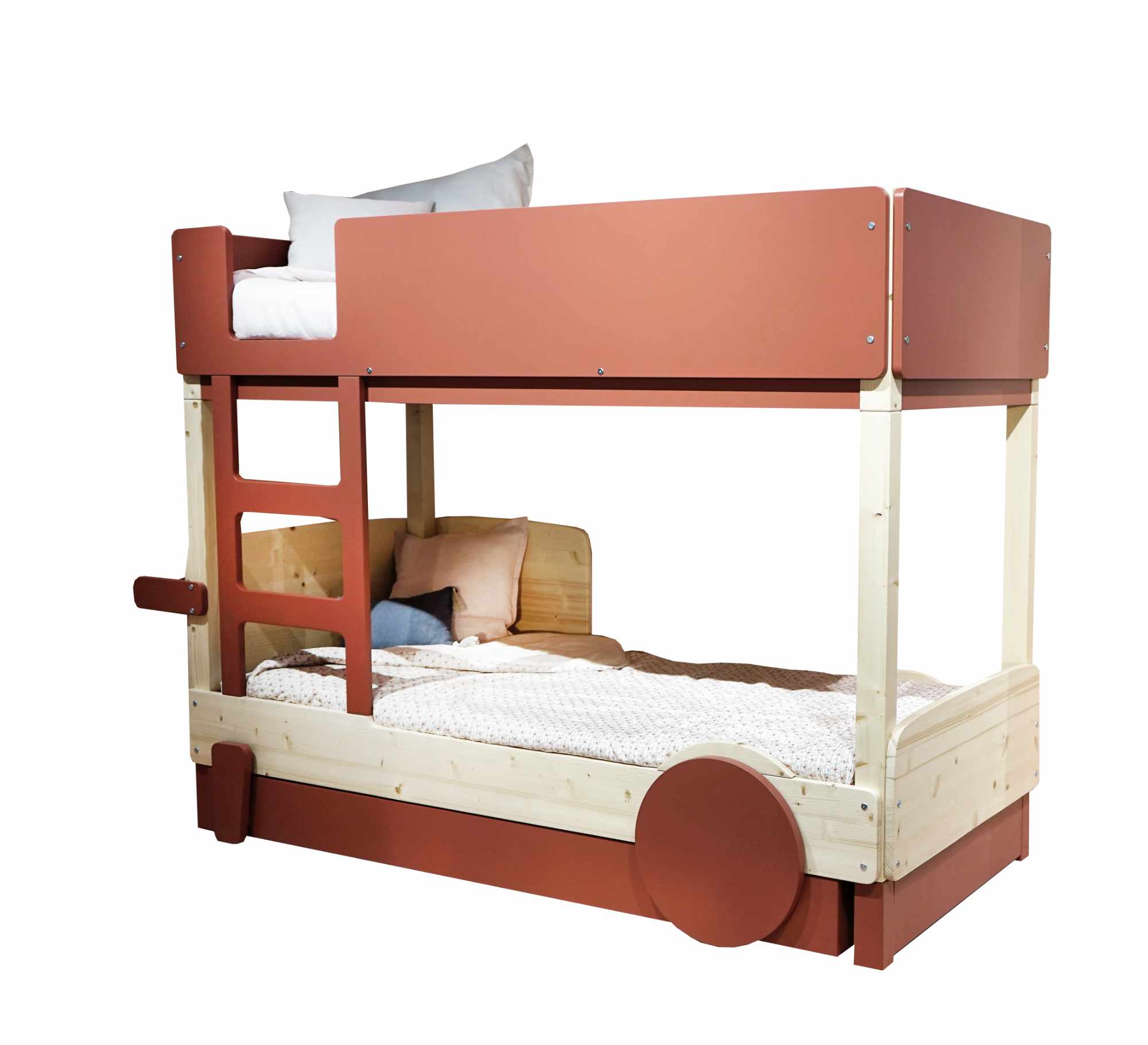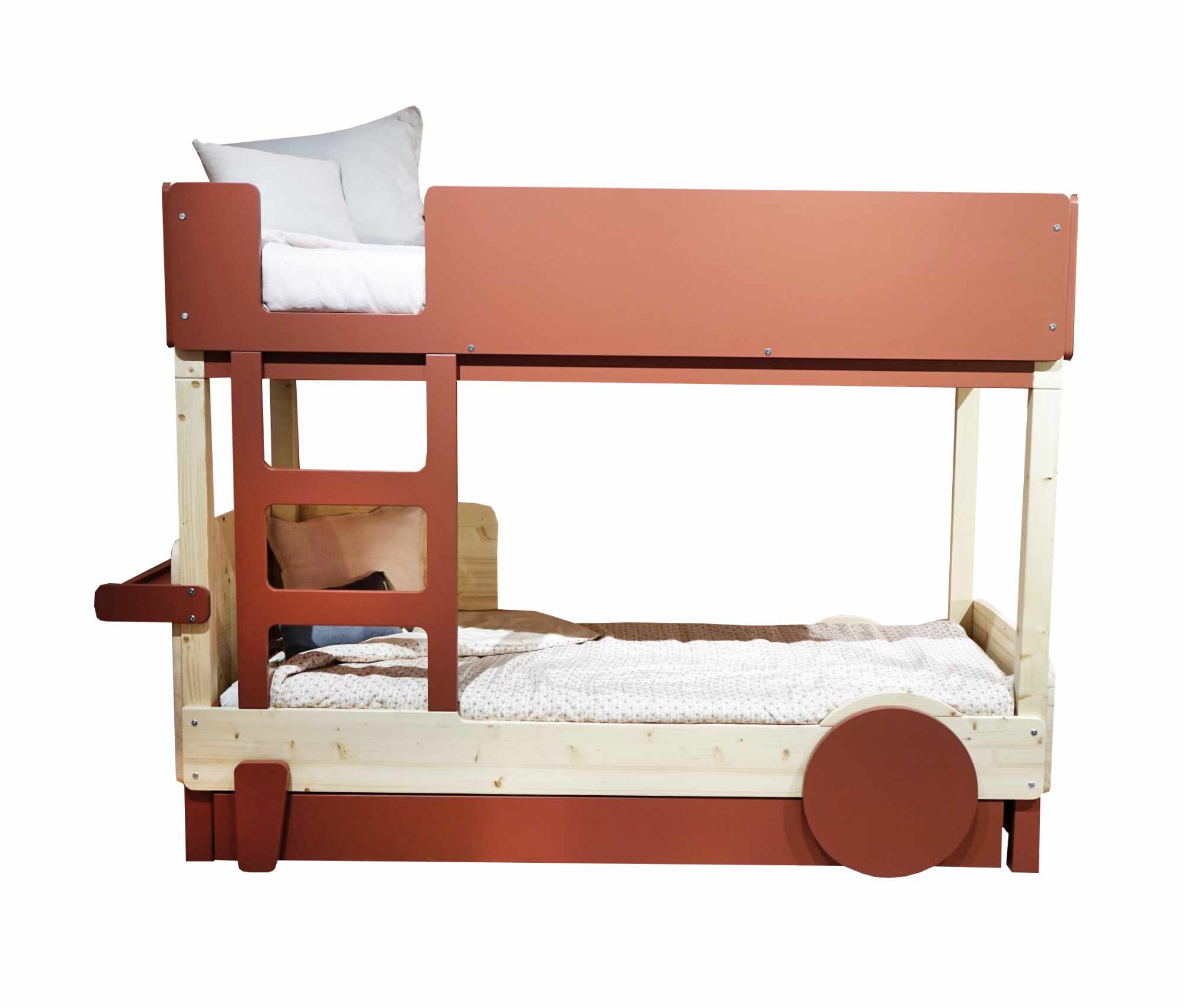 Der Umbausatz, um das Einzelbett Mathy von Bols Discovery in ein Stockbett zu verwandeln. Der Umbausatz passt für Ihr Einzelbett mit Schublade und ohne Schublade. Der Rahmen des Bettes ist aus Kiefernholz und der obere Bettrahmen, die Leiter und der Bettrahmen sind aus MDF gefertigt.