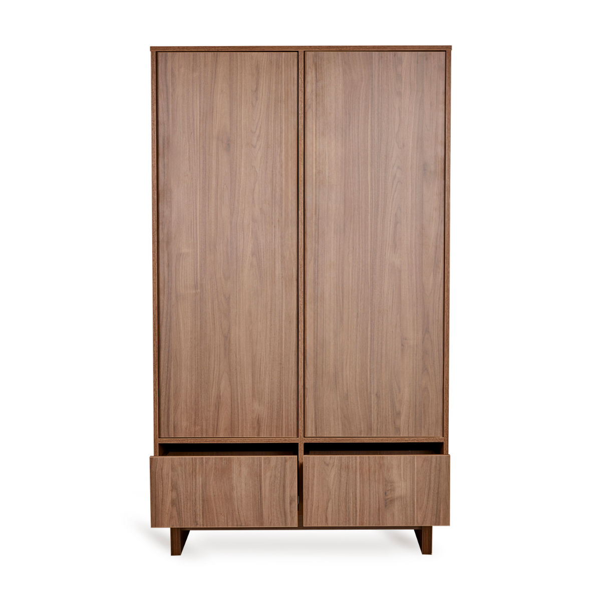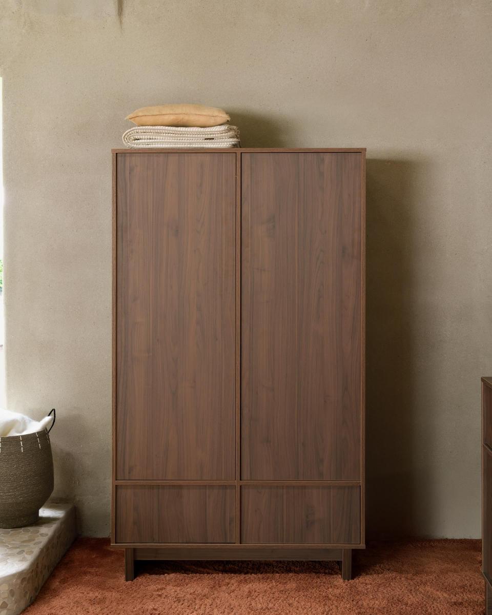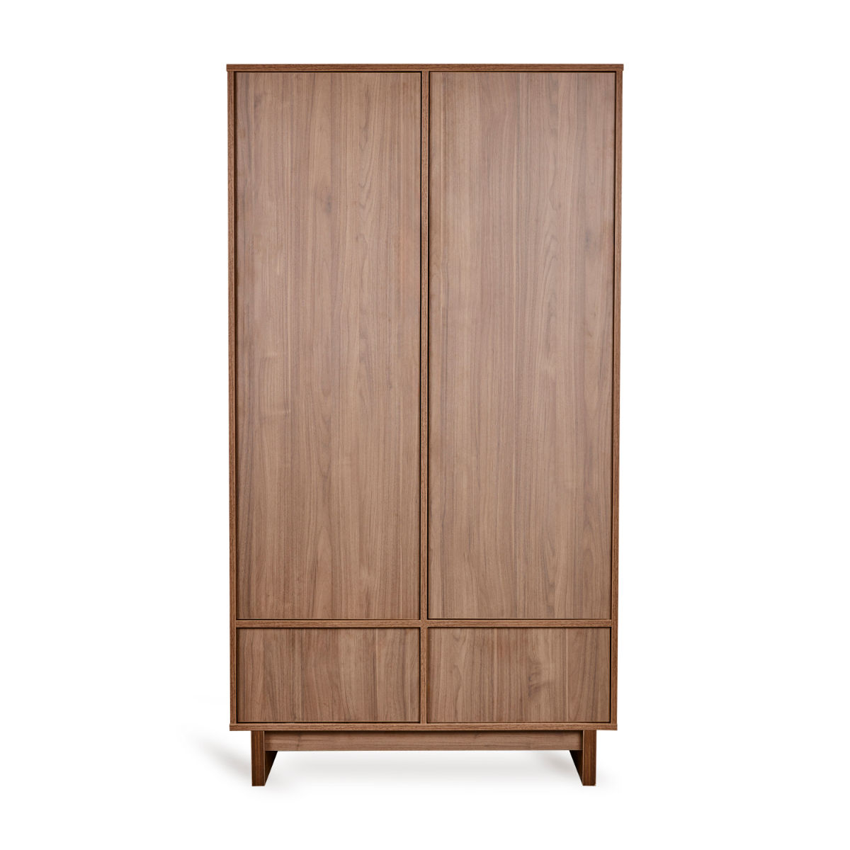 Der kompakte 2-türige Schrank überzeugt mit drei verstellbaren Einlegeböden und zwei Kleiderstangen. Zusätzlich bieten zwei geräumige Schubladen Platz für Kleidung und Accessoires. Dank unsichtbarer Griffe und dem Push-to-Open-System bleibt das Design angenehm ruhig.