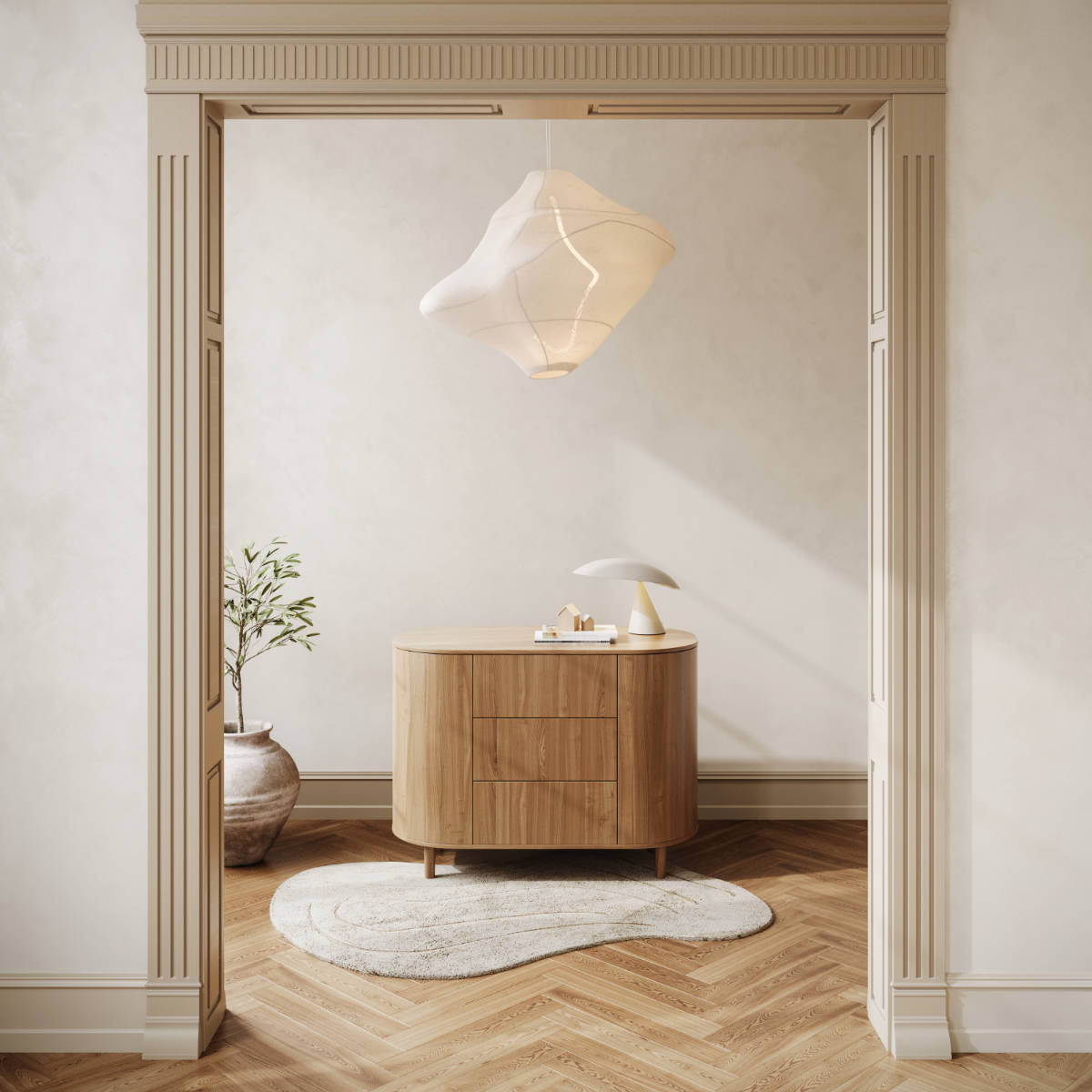 Die dorischen Säulen des antiken Griechenlands dienen als Inspiration für diese einzigartige Kommode. Mit zwei geräumigen Schränken und drei Schubladen bietet sie ausreichend Stauraum. Dank "Easy Touch" sind die Schubladen leicht zu öffnen und zu schließen.