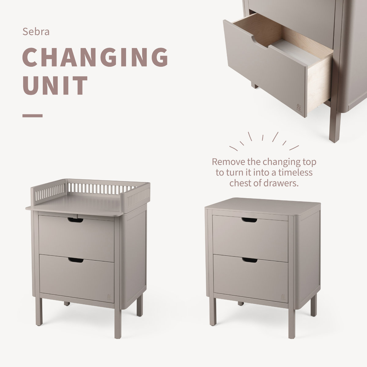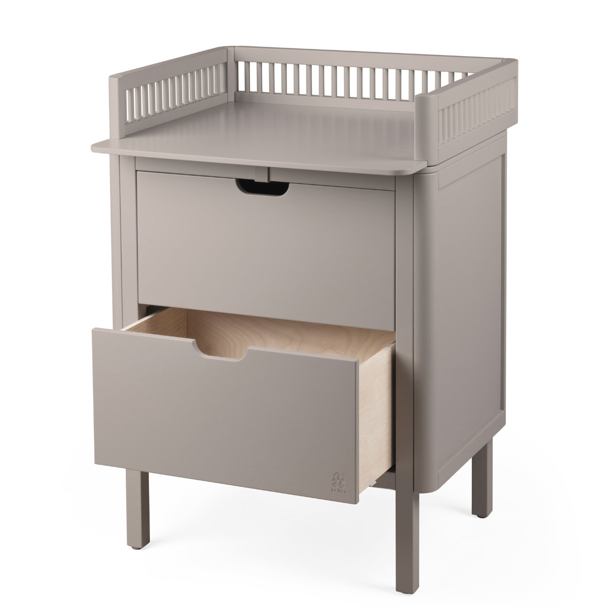 Die Sebra Wickelkommode verfügt über einen skandinavischen und zeitlosen Look, der perfekt mit den restlichen Möbeln aus der klassischen Sebra Möbelkollektion harmoniert, die aus dem Sebra Schreibtisch, dem Sebra Kleiderschrank sowie dem ikonischen Baby und Juniorausziehbett, dem Sebra Bett, Baby & Jr. und dessen Nachfolger, dem Sebra Bett, Junior & Grow, besteht.