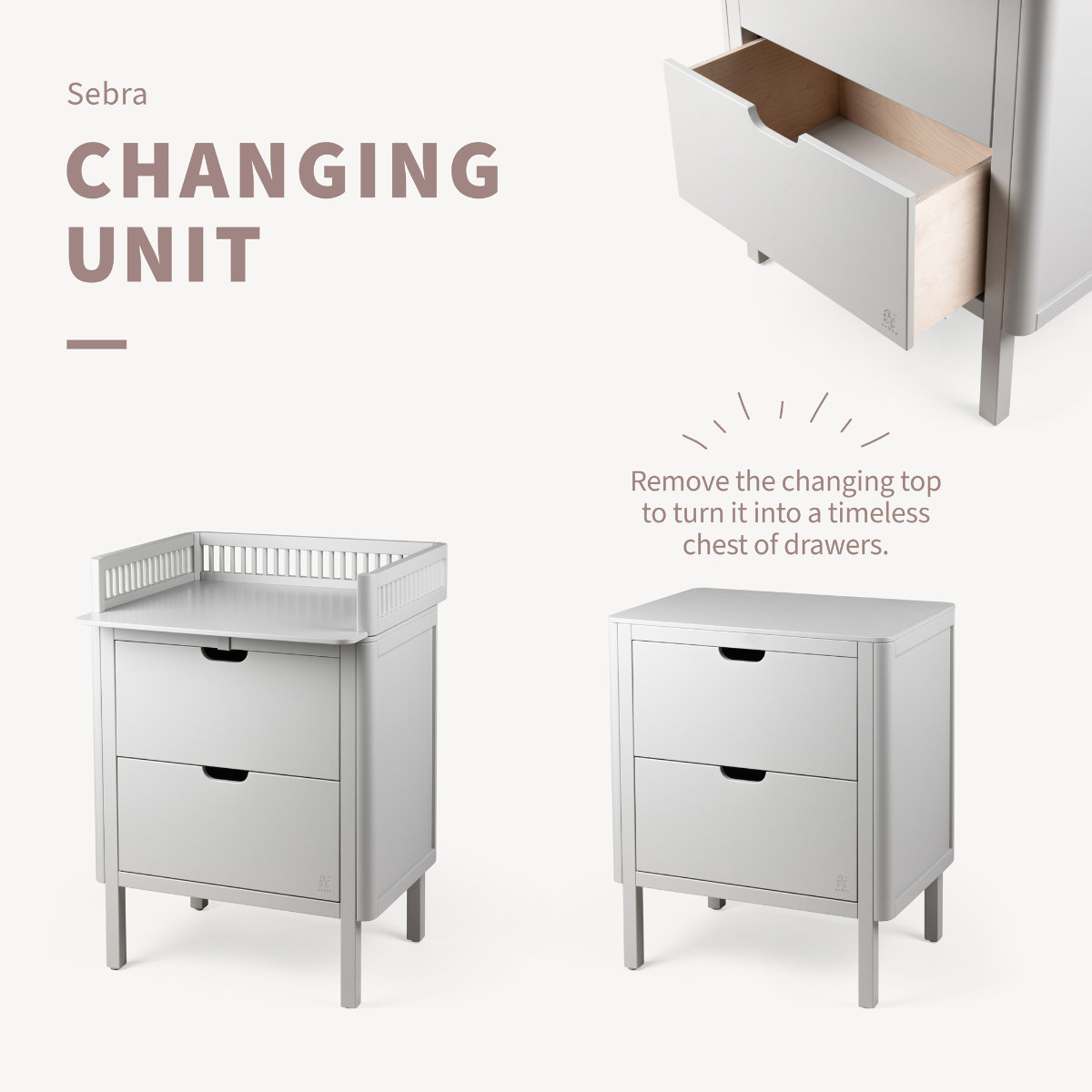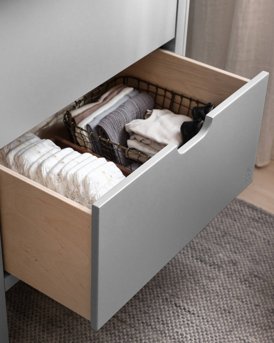 Die Sebra Wickelkommode verfügt über einen skandinavischen und zeitlosen Look, der perfekt mit den restlichen Möbeln aus der klassischen Sebra Möbelkollektion harmoniert, die aus dem Sebra Schreibtisch, dem Sebra Kleiderschrank sowie dem ikonischen Baby und Juniorausziehbett, dem Sebra Bett, Baby & Jr. und dessen Nachfolger, dem Sebra Bett, Junior & Grow, besteht.
