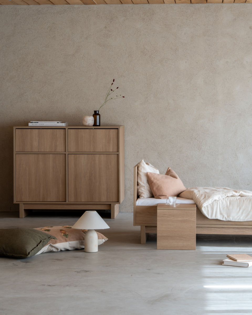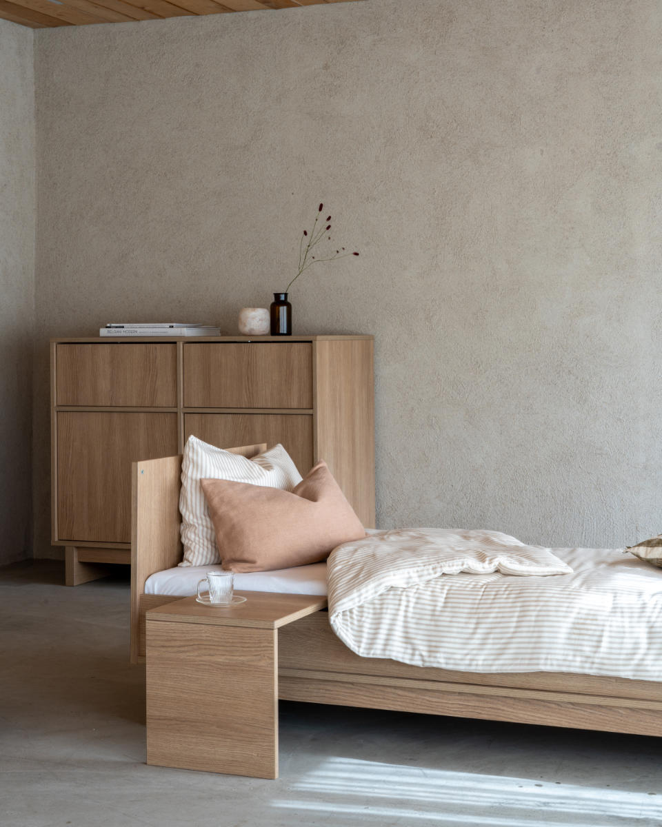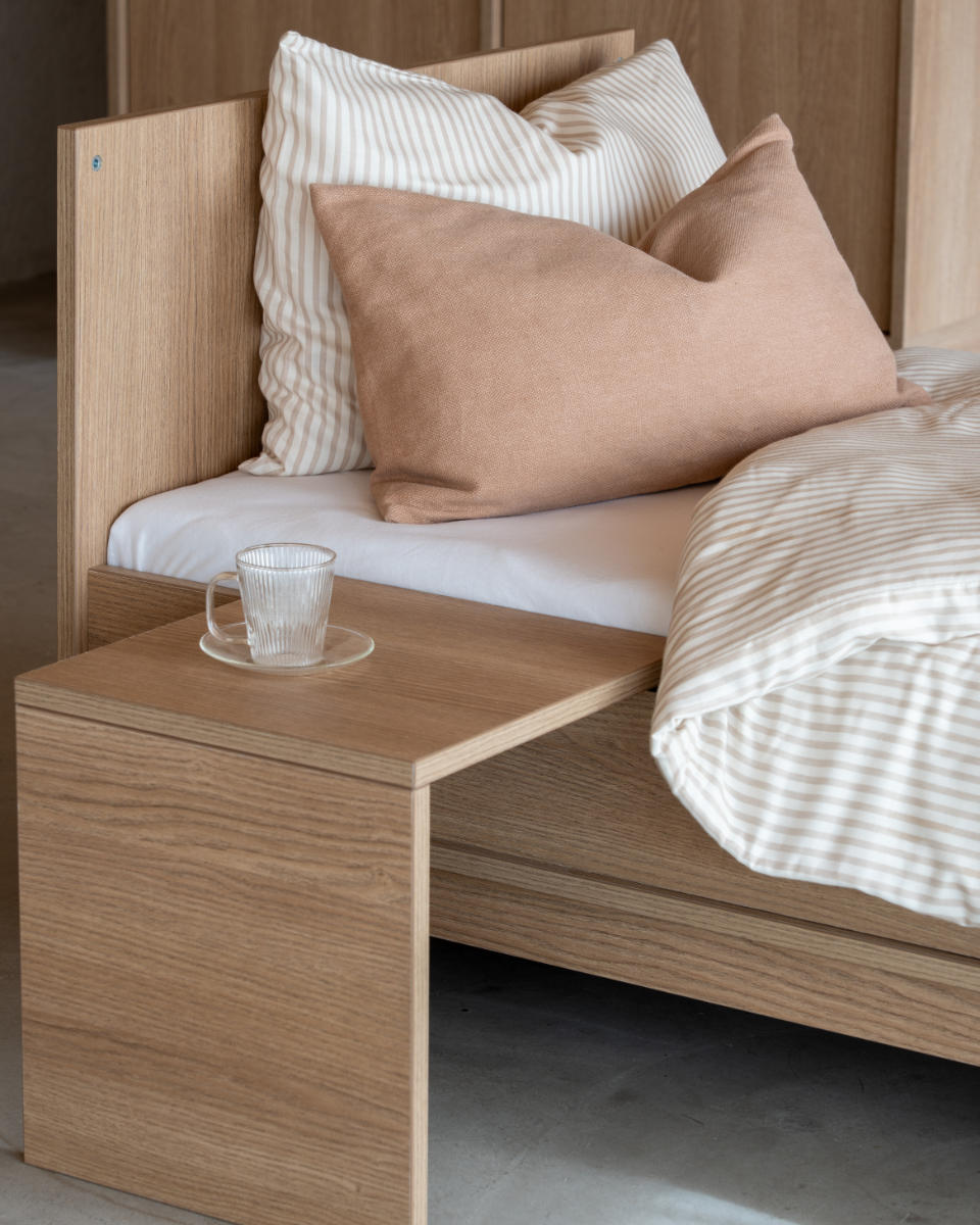 Zum Set gehören eine Lattenrost-Verlängerung sowie ein harmonisch passender Nachttisch, der sich perfekt in das ruhige Design der Kyo-Kollektion einfügt. Der Ausbau ist unkompliziert – für mehr Platz und Komfort beim Schlafen.