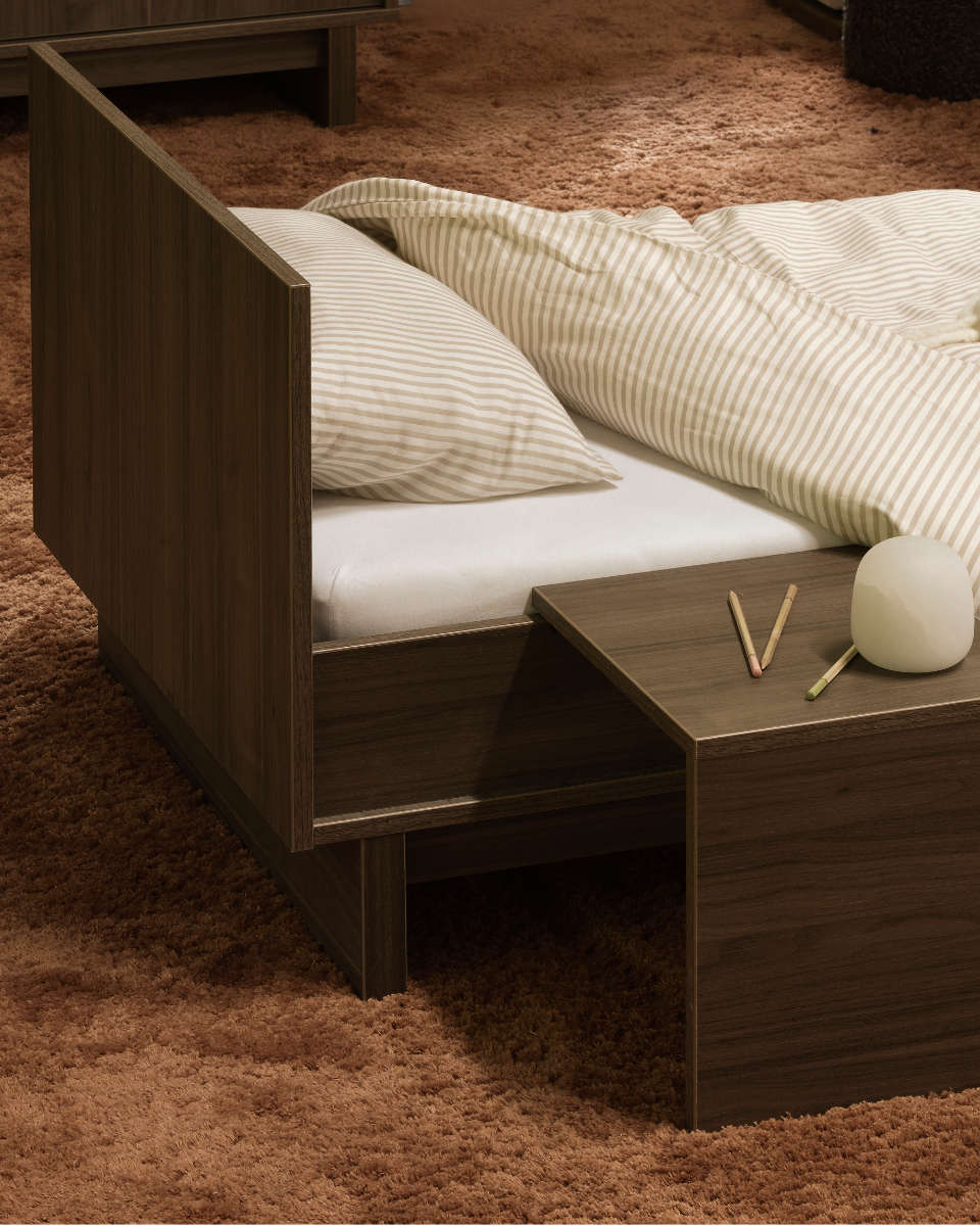 Zum Set gehören eine Lattenrost-Verlängerung sowie ein harmonisch passender Nachttisch, der sich perfekt in das ruhige Design der Kyo-Kollektion einfügt. Der Ausbau ist unkompliziert – für mehr Platz und Komfort beim Schlafen.
