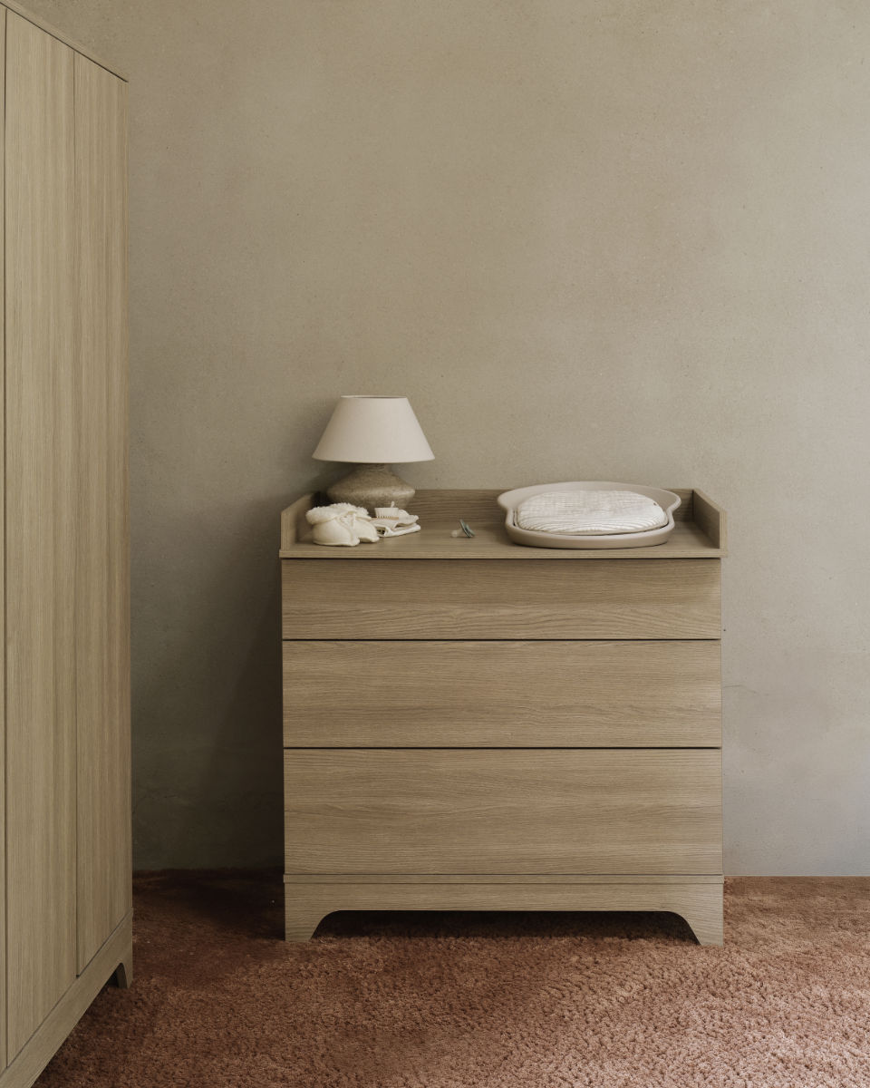 Die stabile, breite Fläche bietet dir genug Raum, um dein Baby sicher zu wickeln, zu pflegen oder anzukleiden. Alles liegt gut erreichbar, sodass du ruhige und angenehme Pflegemomente genießen kannst.