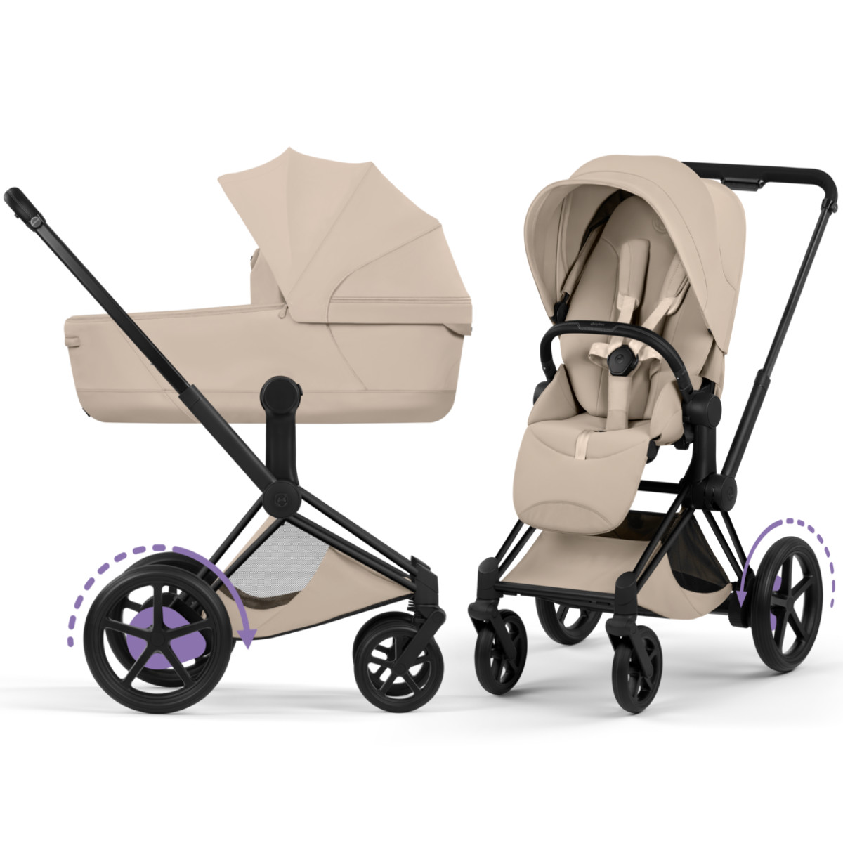 Der Kinderwagen lässt sich flexibel anpassen. Du kannst zwischen Babywanne, Babyschale (separat erhältlich) und Sitzeinheit wechseln. Dadurch begleitet dich der E-Priam zuverlässig über mehrere Jahre hinweg.