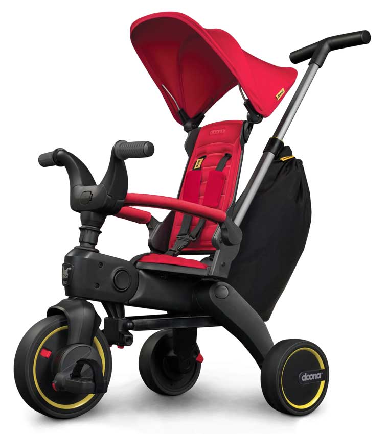 - Phase 4 (Fahrradmodus): ab ca. 30 Monaten – Nutzung wie in Phase 3, das Kind lenkt alleine, mit niedriger Rückenlehne und ohne Schiebestange