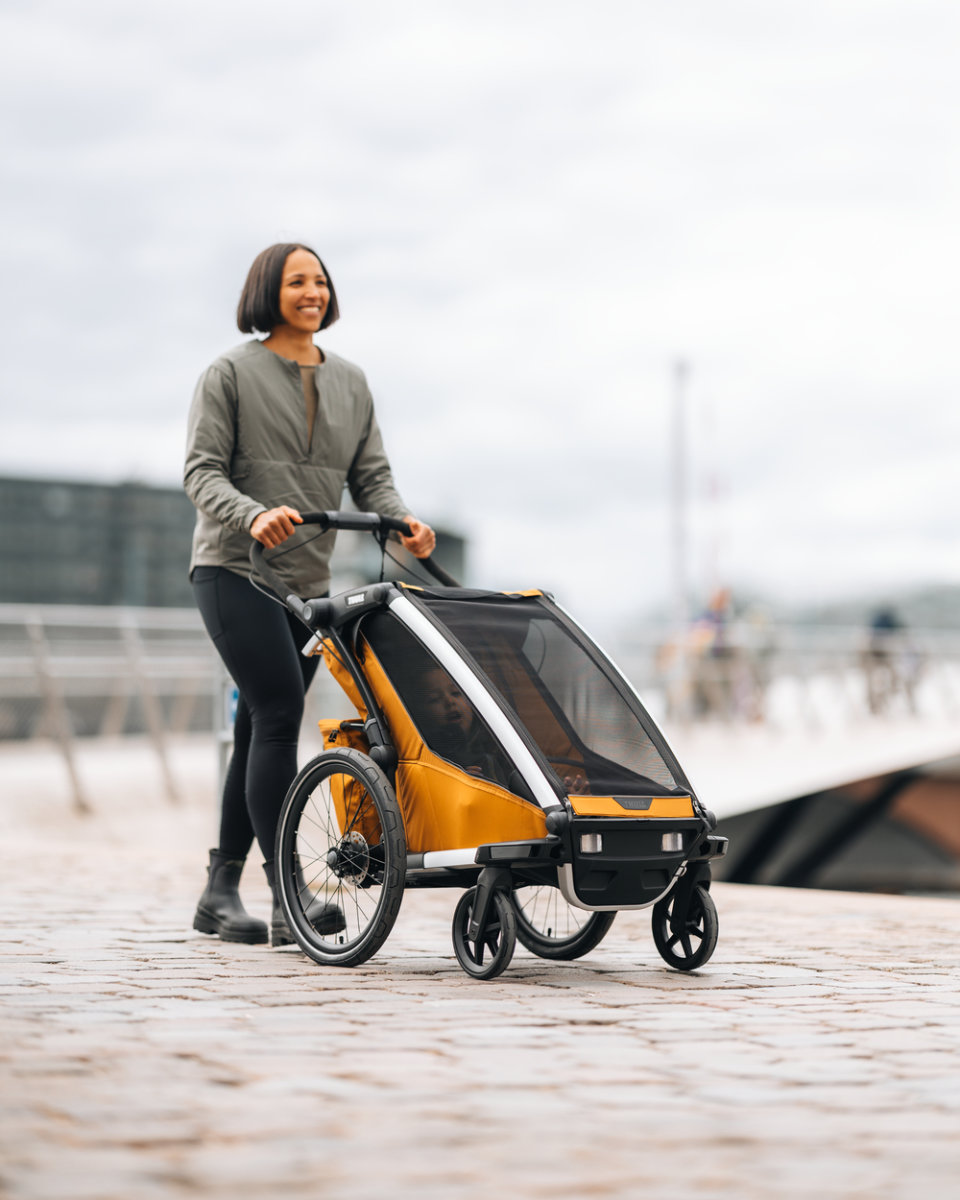 - Dank der verbesserten, einhändigen 180-Grad-Raddrehung kannst du den Anhänger blitzschnell in einen Kinderwagen verwandeln.