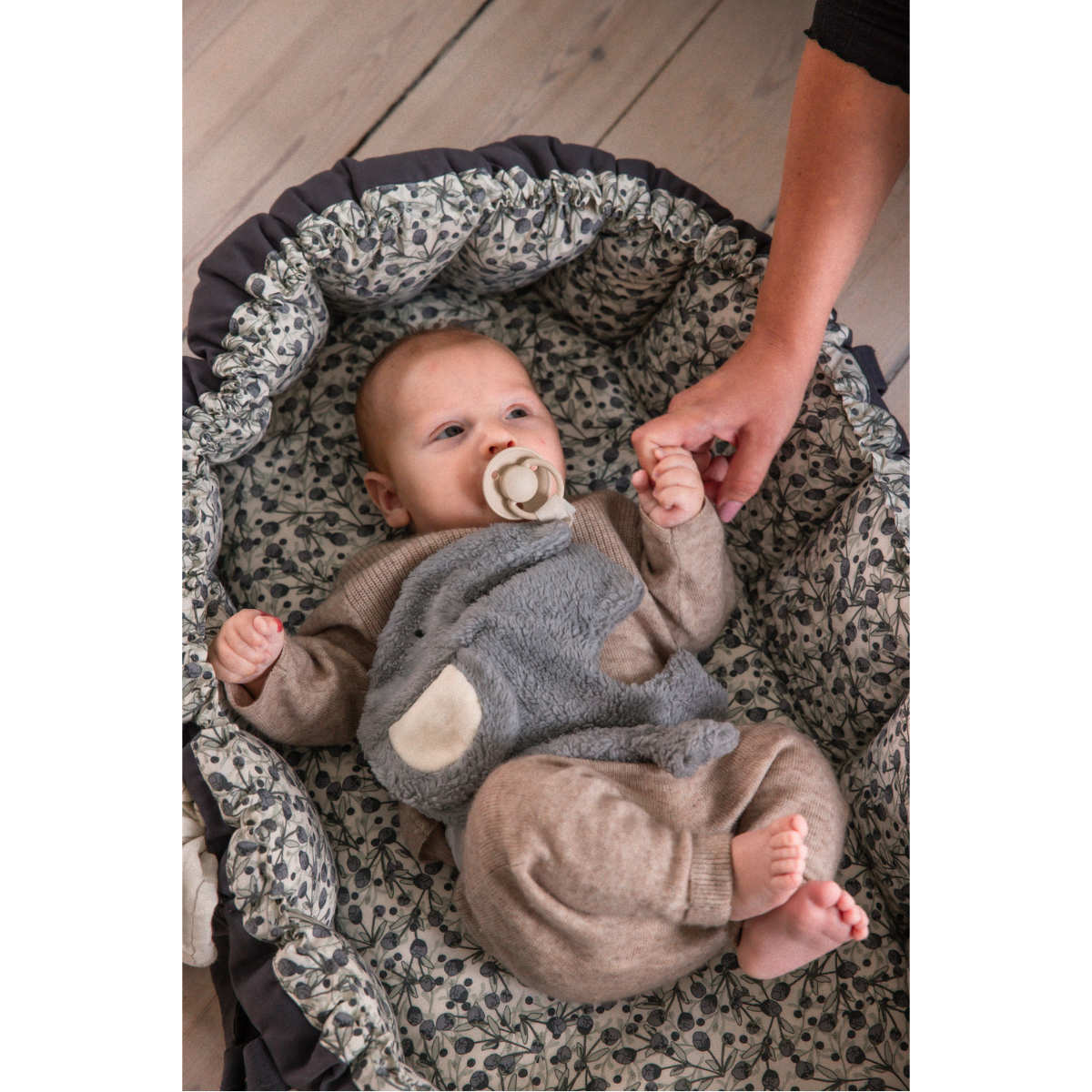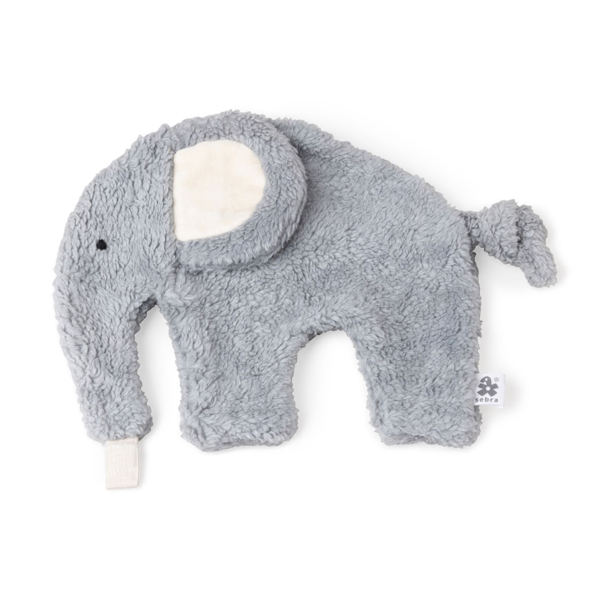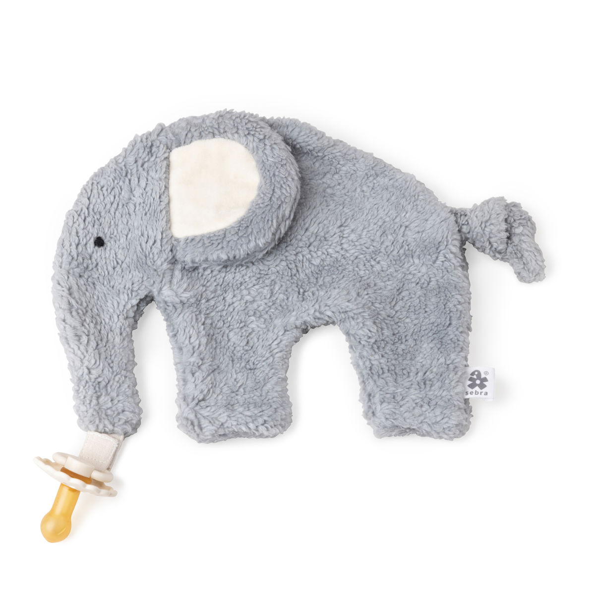 Die weichen Ohren und der geknotete Schwanz laden zum Fühlen und Entdecken ein. Dank des Klettverschlusses am Rüssel kann ein Schnuller sicher befestigt werden – perfekt für den Kinderwagen, das Bettchen oder unterwegs.