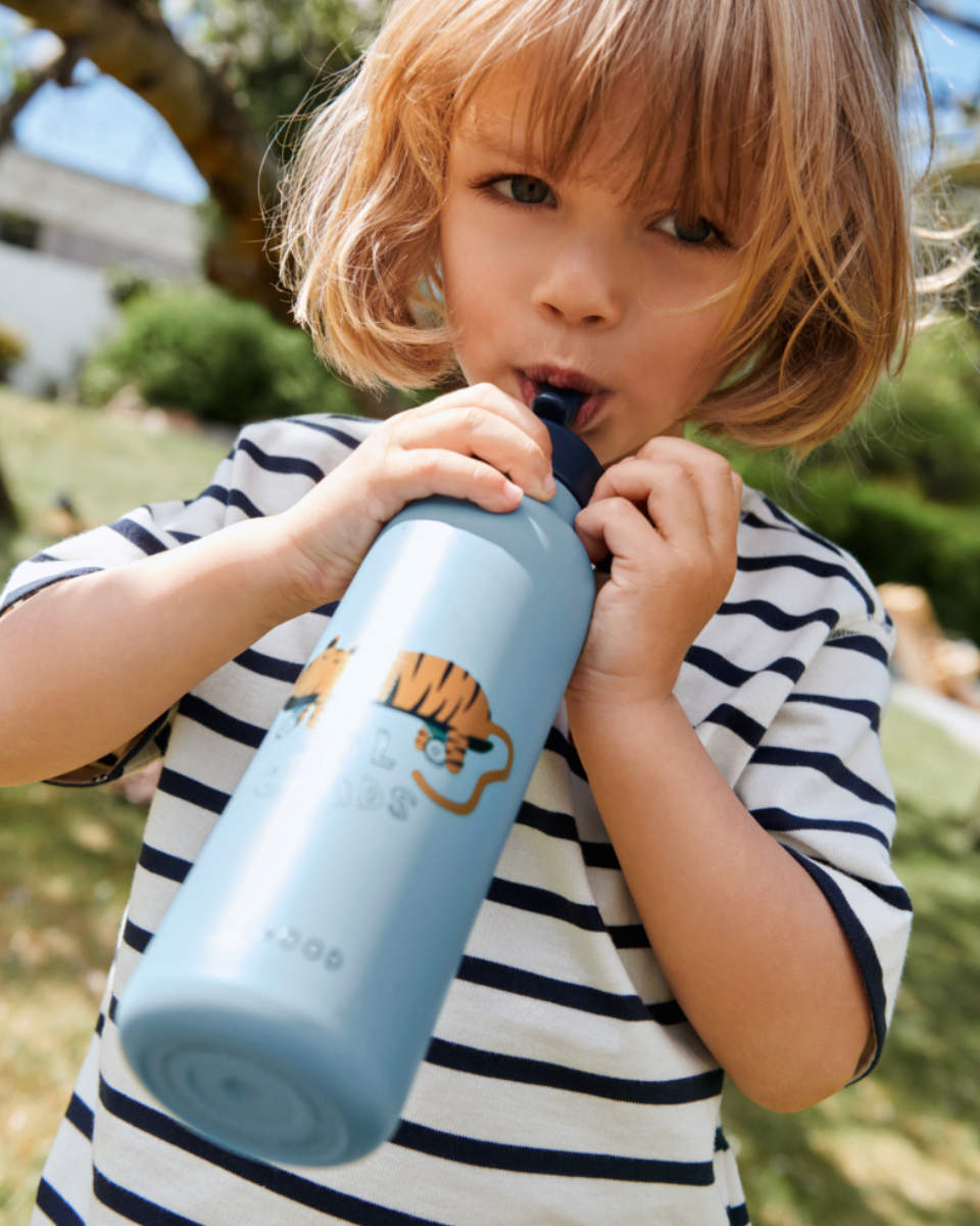 Die Liewood Falk Wasserflasche ist aus Stahl und fasst 350 ml Flüssigkeit und kann diese bis zu 24 h kalt und bis zu 12 heiß halten. Die Flasche ist unzerbrechlich (wichtig für Kleinkinder) und auslaufsicher. Kombiniert mit einer Brotdose aus Edelstahl kannst du ausreichend Proviant für einen Ausflug oder die Schule einpacken.