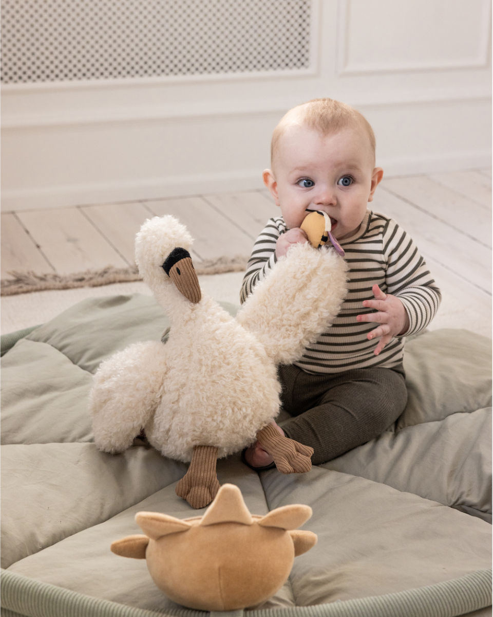 Dank der praktischen Klettverschlüsse an den Flügeln kann dein Kind diese selbstständig öffnen und schließen – ein tolles Training für die Feinmotorik. Ob als sanfte Einschlafhilfe im Bettchen oder als spannendes Entdeckerspielzeug auf der Krabbeldecke: Dieser Schwan passt sich an. Und weil uns die Zukunft deines Kindes am Herzen liegt, besteht die Füllung zu 100 % aus recyceltem Polyester.
