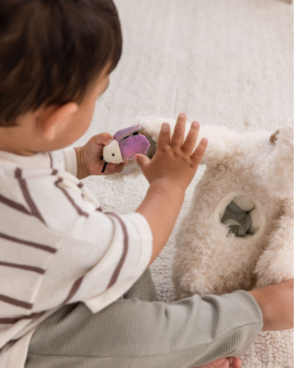 Es gibt so viel zu finden! Auf seinem Rücken trägt der Schwan einen niedlichen Frosch, der sich herausnehmen lässt und bei Bewegung lustig rasselt. Doch das ist erst der Anfang: Unter einem der kuscheligen Flügel versteckt sich eine kleine Biene in einer Geheimtasche. Dieses Versteckspiel sorgt für riesigen Spaß und fördert spielerisch die Hand-Auge-Koordination.