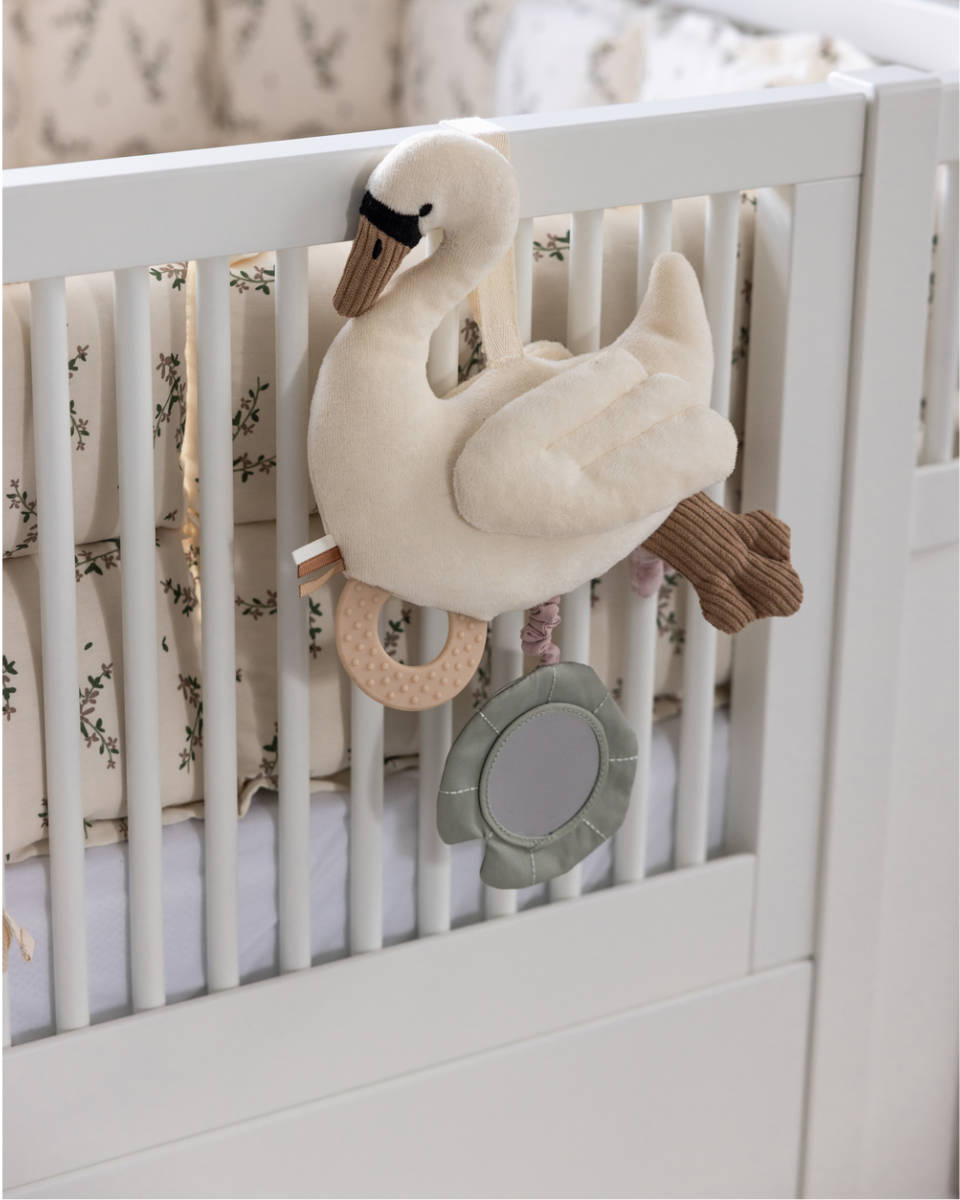 Ganz gleich, für welches Modell du dich entscheidest – dein Baby wird begeistert sein, die vielen Details zu erkunden. Der Schwan überzeugt mit knisternden Flügeln, unterschiedlichen Strukturen zum Fühlen sowie einem versteckten Spiegel im Blatt-Element. Die Libelle regt mit sanften Rasselgeräuschen und schimmernden Stoffen gezielt die akustische und visuelle Wahrnehmung an. Mithilfe des praktischen Klettverschlusses lässt sich das Spielzeug flexibel befestigen – genau dort, wo dein Baby es braucht.