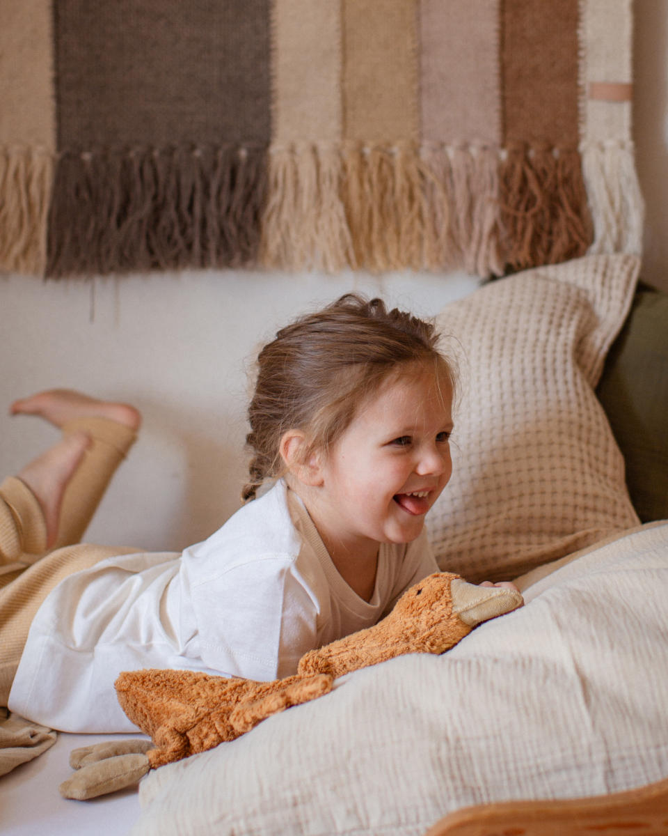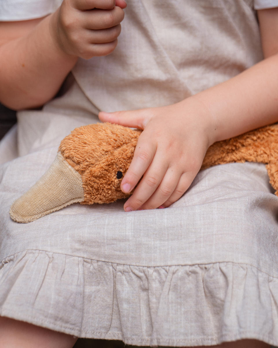 Die Gans besteht aus GOTS-zertifizierter Bio-Baumwolle und ist mit Schafschurwolle sowie einem herausnehmbaren Traubenkernkissen gefüllt. Die Fertigung erfolgt in sorgfältiger Handarbeit in Europa – ein Qualitätsprodukt, das Mensch und Umwelt guttut.