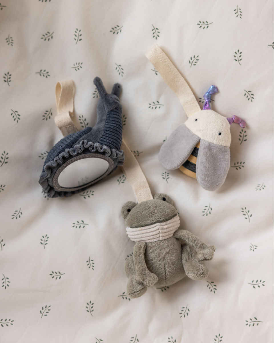 - Blume, Libelle & Schwan: Eine kuschelige Blume mit Greifelementen, eine Libelle mit funkelnden Knisterflügeln und ein eleganter Schwan mit integriertem Rasselgeräusch.