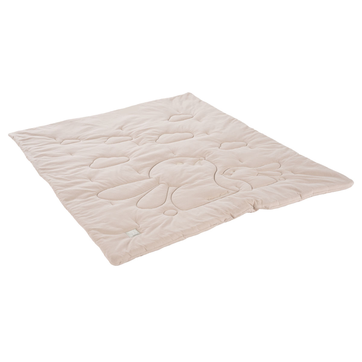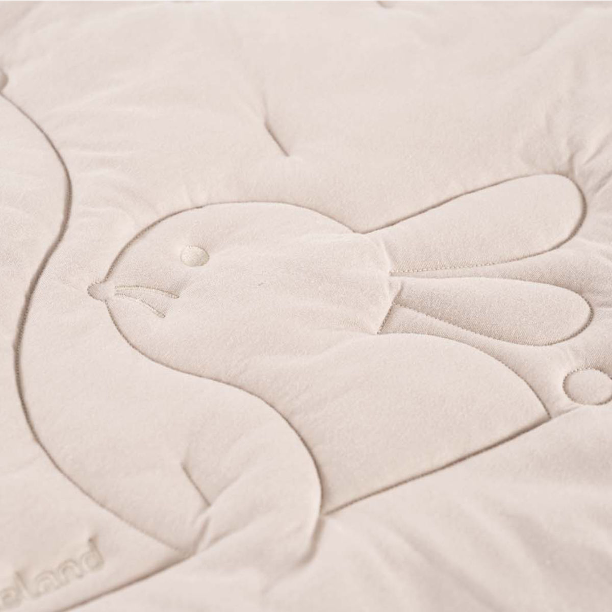 Gerade beim Spielen auf dem Boden ist ein angenehmes Hautklima besonders wichtig. Die Oberseite besteht aus einer hochwertigen Kombination aus 95 % Baumwolle und 5 % Elasthan. Baumwolle sorgt für Atmungsaktivität und Strapazierfähigkeit, während Elasthan der Decke eine angenehme Elastizität verleiht. So bleibt sie formstabil und passt sich dennoch sanft den Bewegungen deines Babys an.