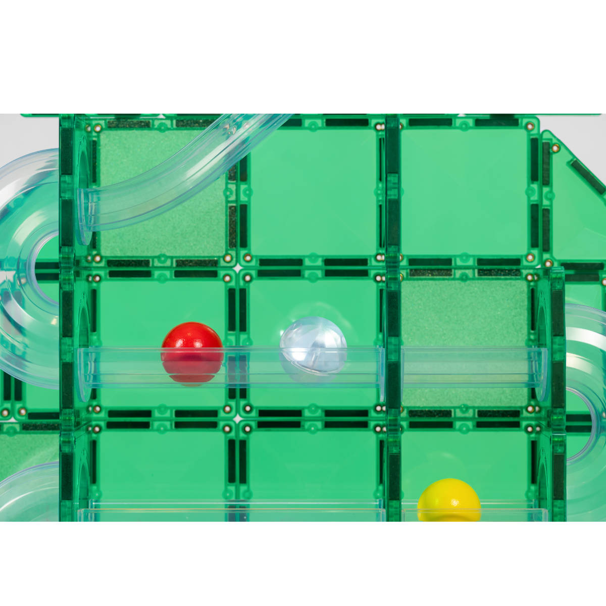 Das Set enthält 71 hochwertige Magnetkacheln in festlichen Farben – Grün, Rot und Gelb – sowie funkelnde Spezialteile. Das absolute Highlight: die exklusive Light-Up Kugel, die beim Rollen leuchtet! Die transparenten Röhren lassen die Kugeln mit Tempo und Glanz durch die Bahn flitzen – für echten Bauspaß mit Wow-Effekt.