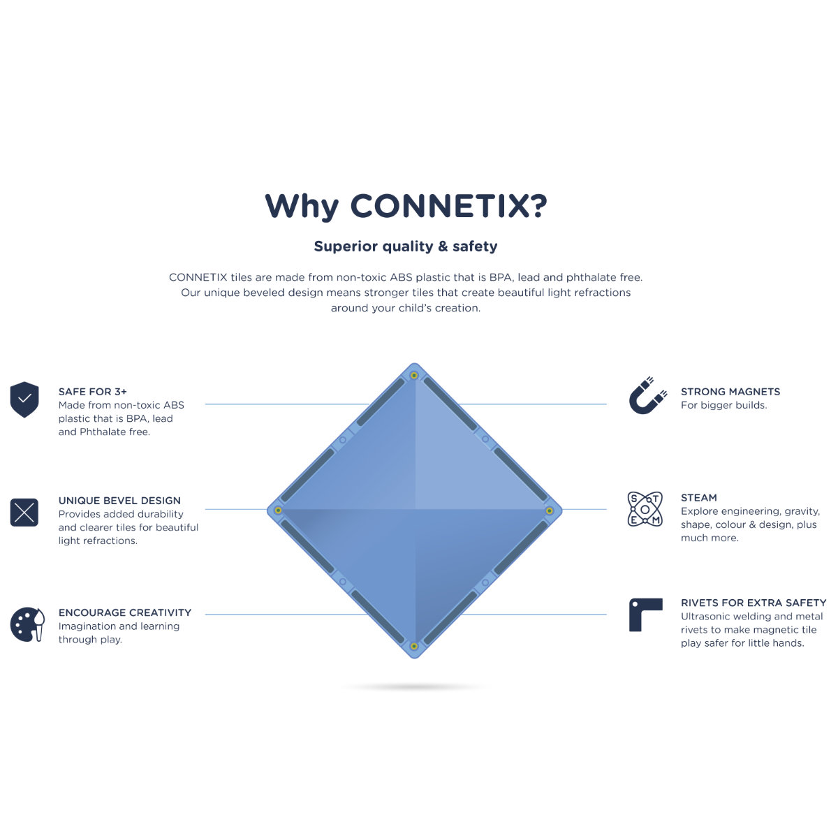 Des Weiteren ist Connetix ein nicht-toxisches Lernspielzeug. Alle Magnetplatten bestehen aus ungiftigem ABS-Kunststoff, der BPA- und phthalatfrei ist, was die Platten auch für kleinere Kinder sicher macht, die sie in den Mund nehmen könnten.