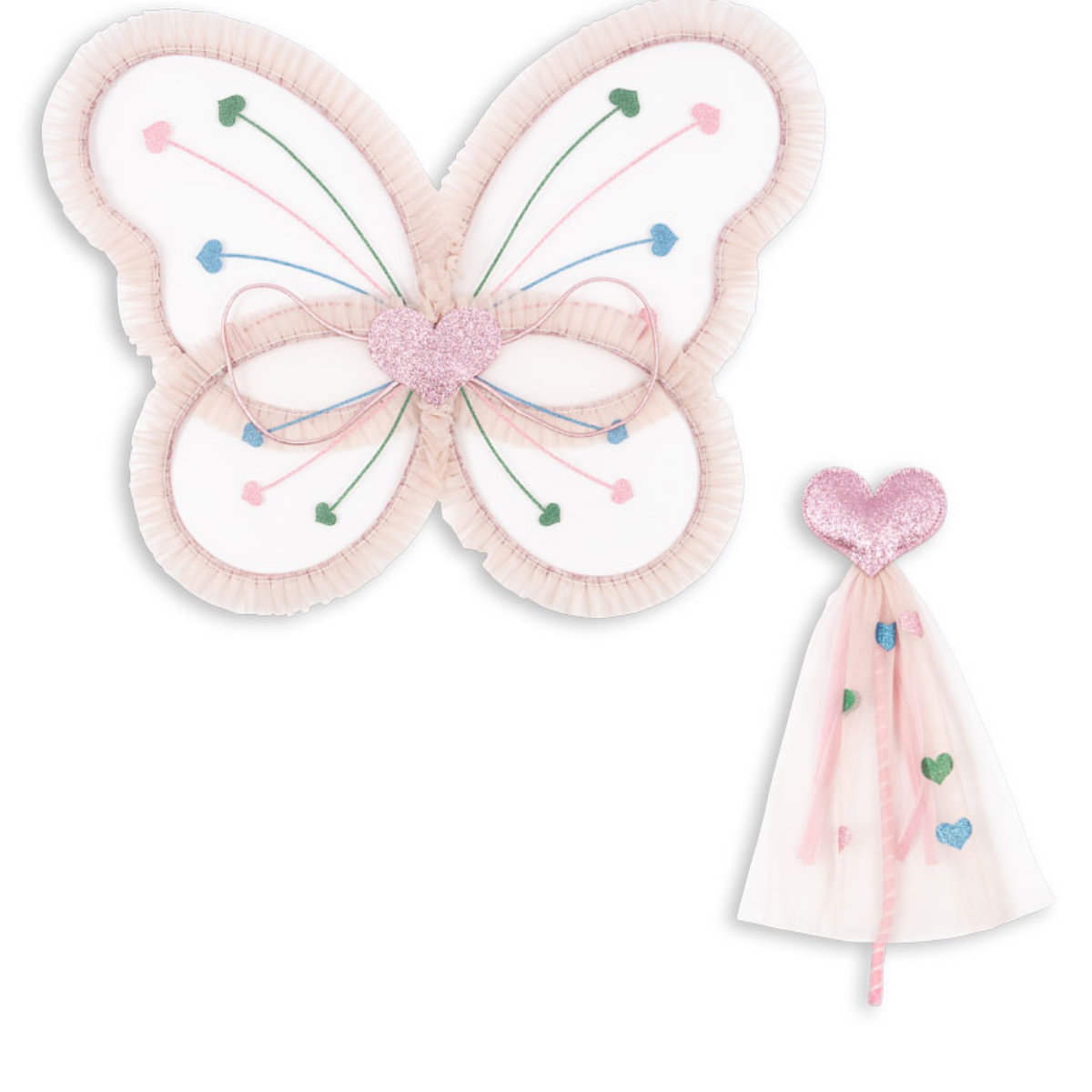 Die transparenten, glitzernden Feenflügel funkeln wunderschön im Licht und lassen sich dank der leichten Bänder angenehm tragen. Der passende Zauberstab mit herzförmigem Detail rundet das Kostüm ab und lädt zum fantasievollen Spielen, Tanzen und Träumen ein.