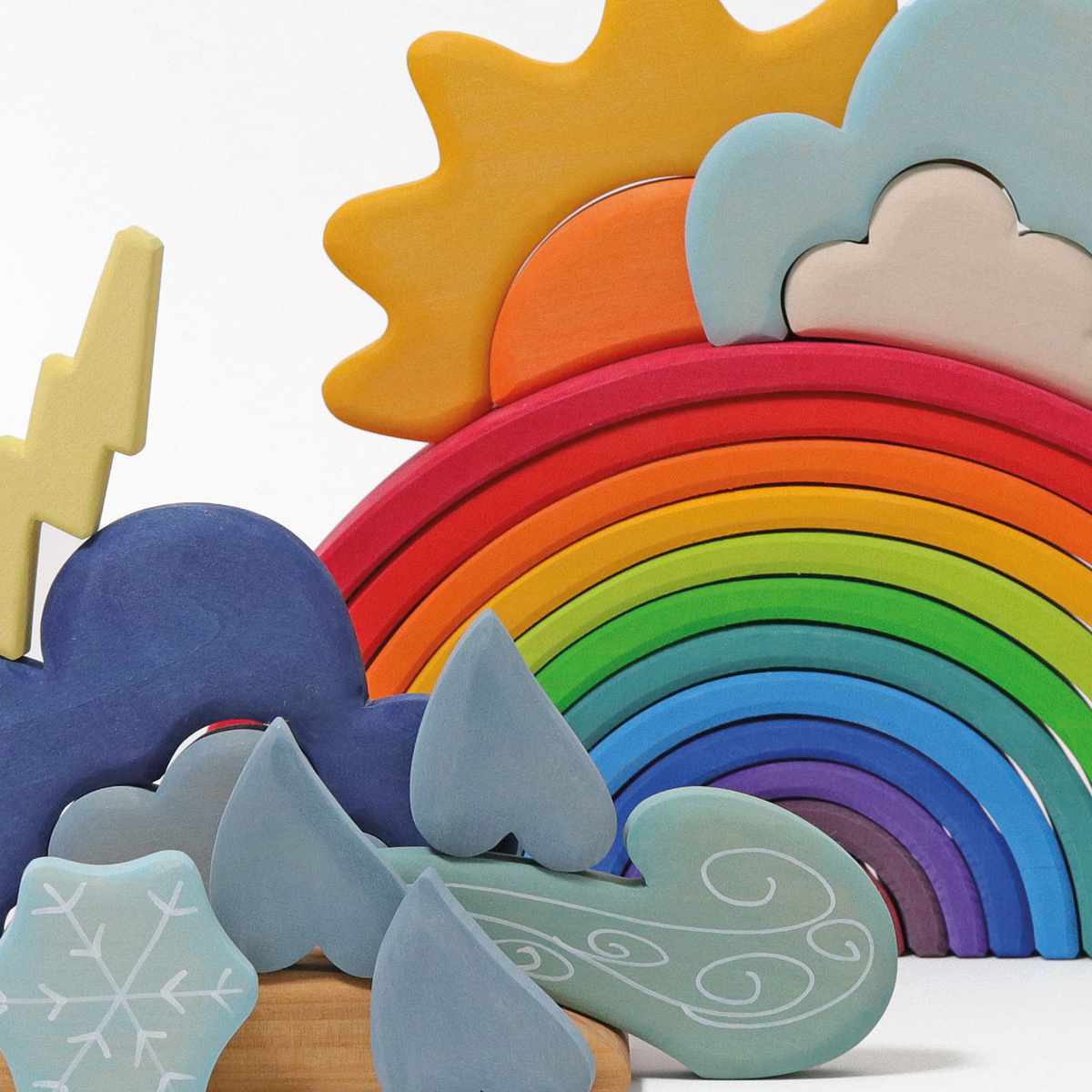 Das Bauspiel ist eine ideale Ergänzung zu unserer großen zwölfteiligen Regenbogenreihe. Kinder jeden Alters können die Sonne scheinen lassen, Blitz und Donner entfachen oder Schnee und Regen herabfallen lassen. Ein kräftiger Sturm vertreibt die Wolken, damit die Sonne wieder alles erwärmen und trocknen kann.