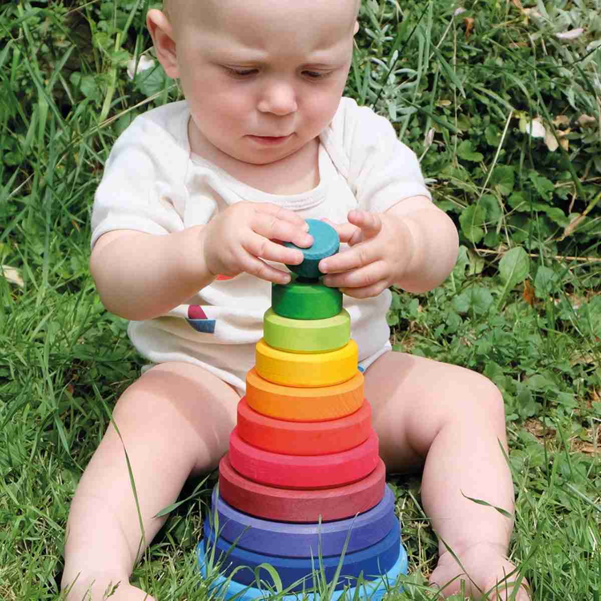 Mit dem großen Stapelturm von Grimms können Kinder auf spielerische Weise Farben und Größen entdecken. Das Bauen und Stapeln mit diesem Turm fördert die motorischen Fähigkeiten und bietet kreativen Spiel- und Bauspaß.