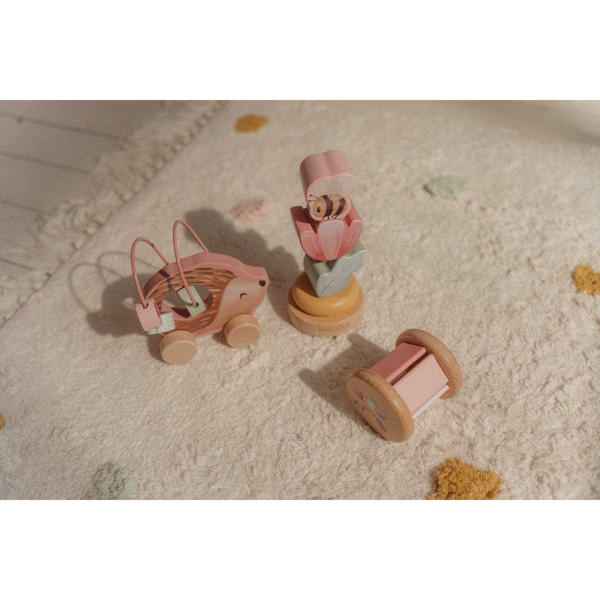 Das Set enthält eine Roll-Rassel, die zum Greifen und Schütteln einlädt, sowie einen niedlichen kleinen Stapler mit Blöcken für den Bau eines Pilzes oder einer Blume. Ebenfalls dabei ist ein rollender Käfer oder Igel, dessen Rücken mit Perlen verziert ist, die sich entlang einer Spirale bewegen.