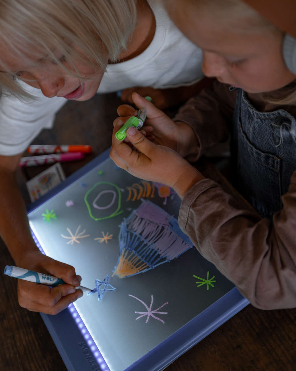 Das zweiseitige Design sorgt für endlosen Zeichenspaß: Eine Seite ist ein LED-Leuchtboard mit drei Helligkeitsstufen, die andere eine Kreidetafel-Fläche für bunte Zeichnungen. Vier Neon-Kreidemarker sind bereits im Set enthalten – für sofort leuchtenden Spaß!