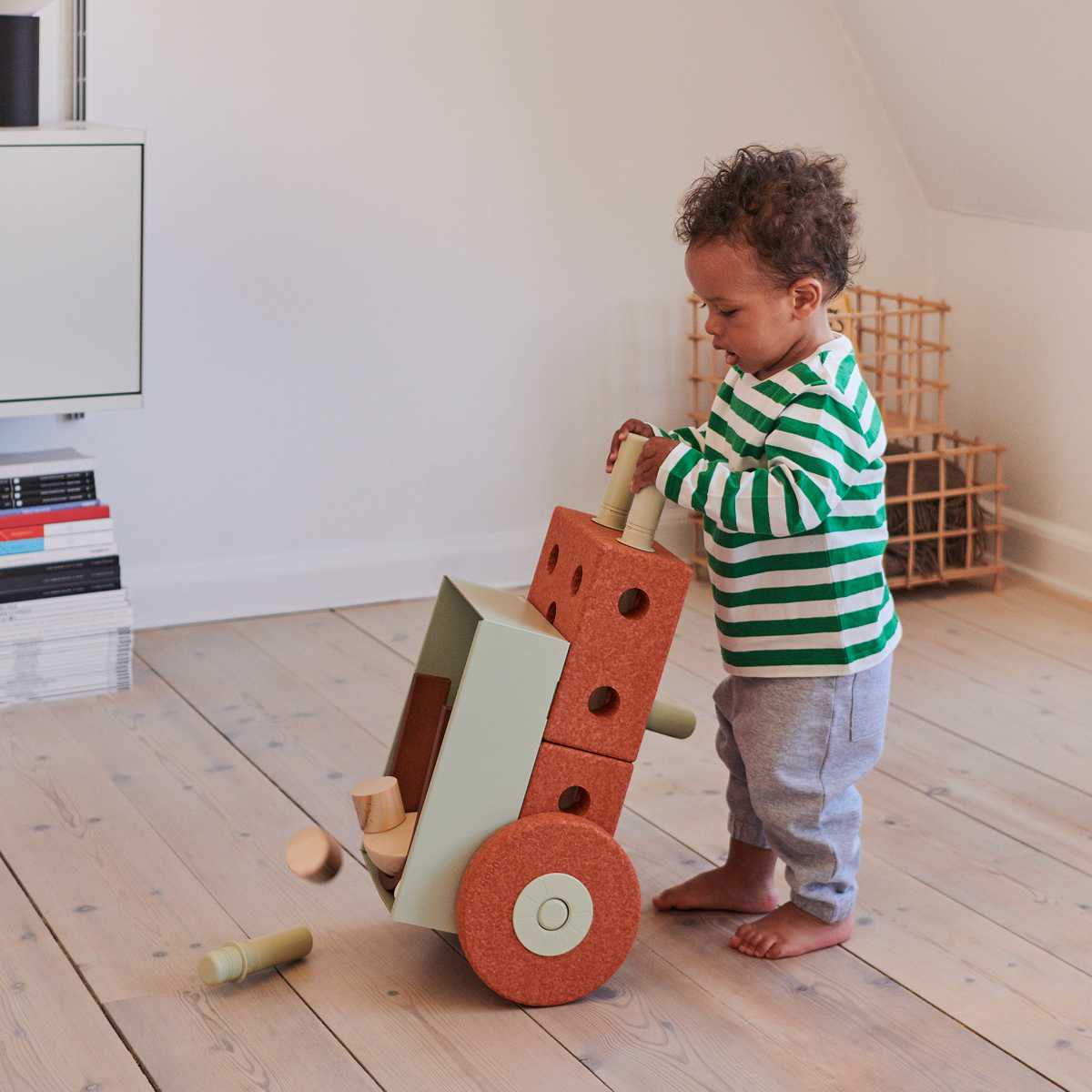 - Flexibler Umbau: In wenigen Handgriffen lässt er sich in eine Schubkarre oder einen Tritthocker verwandeln. Damit bietet das Spielzeug immer neue Anreize und trainiert verschiedene Fertigkeiten.