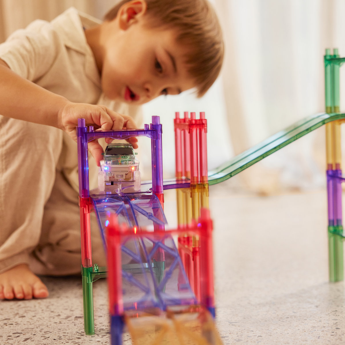 Die magnetischen Bausteine wie Quadrate, Rechtecke und Säulen sind kompatibel mit Connetix und Magna-Tiles. Nur die speziellen Rennbahnelemente sind ausschließlich für Cleverclixx-Fahrzeuge ausgelegt. So kannst du deine Sammlung flexibel erweitern und kombinieren.