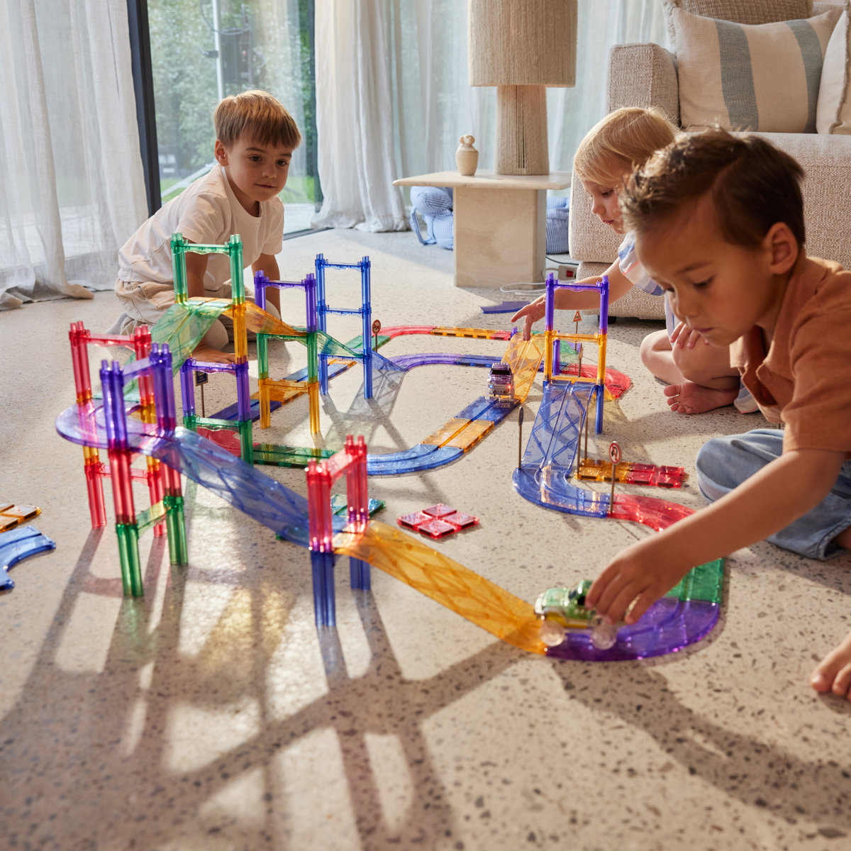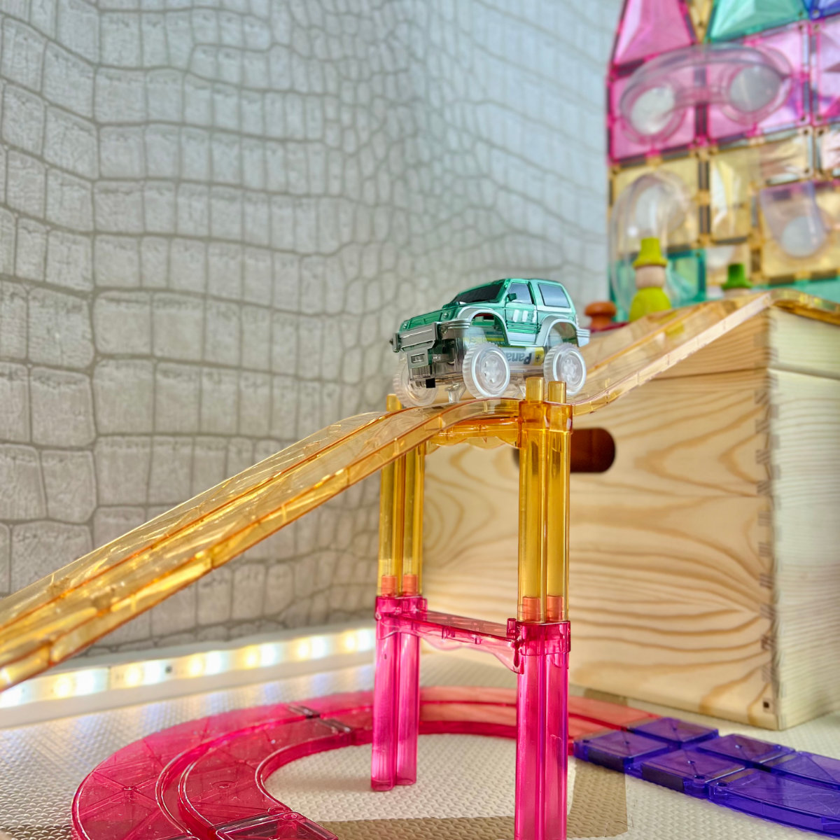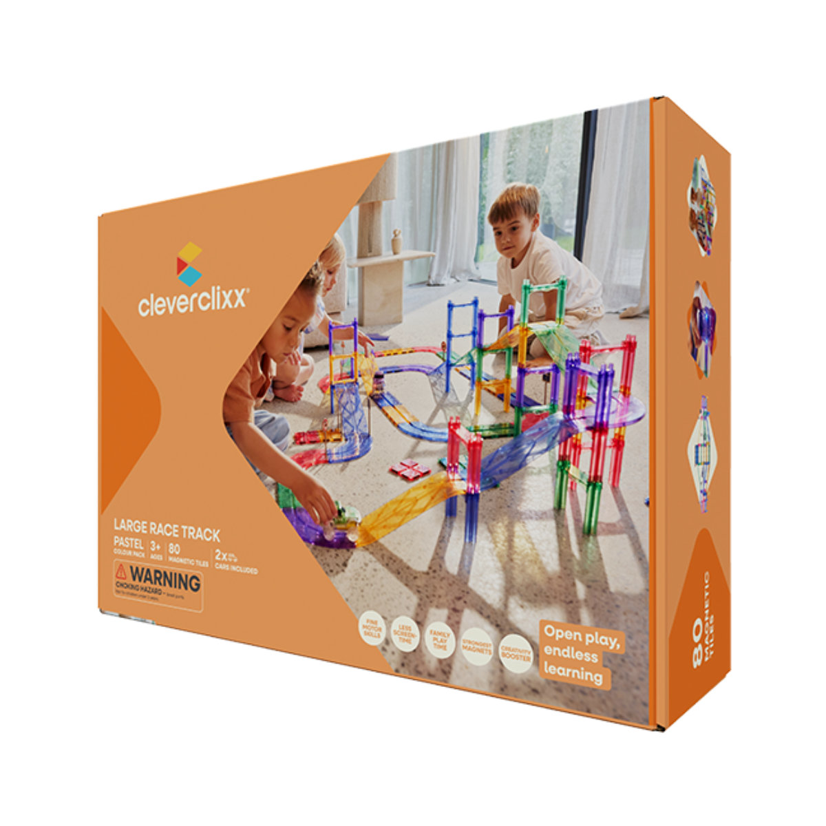 Achtung: Die Rennbahn-Elemente passen nur zu Cleverclixx-Autos und sind nicht mit den Fahrzeugen von Connetix, Magna-Tiles oder Magformers kompatibel.