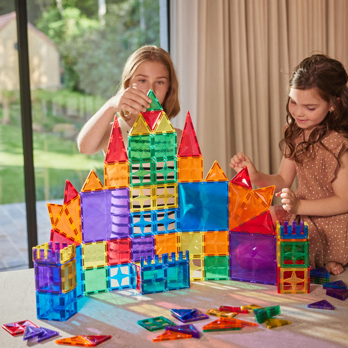 Der Cleverclixx Erfindungs-Bausatz in Knallfarben – 110 Teile Magnetbausteine lässt sich perfekt mit anderen Cleverclixx-Sets kombinieren und ist kompatibel mit Connetix und Magna-Tiles. So kannst du Schritt für Schritt deine Sammlung erweitern und immer größere Bauwerke gestalten.