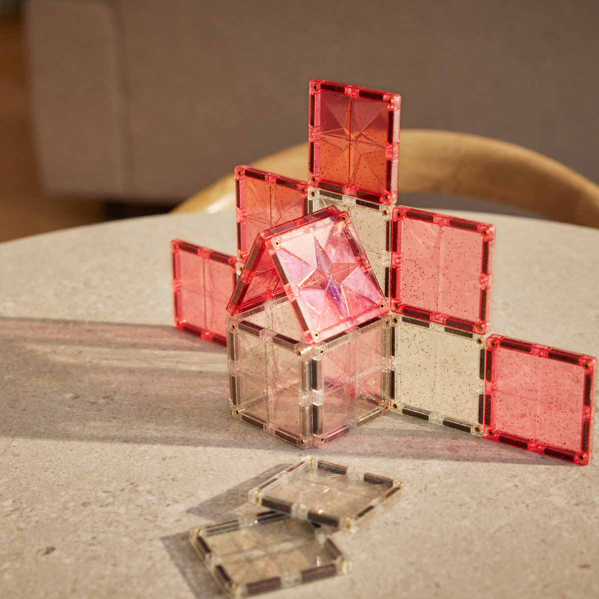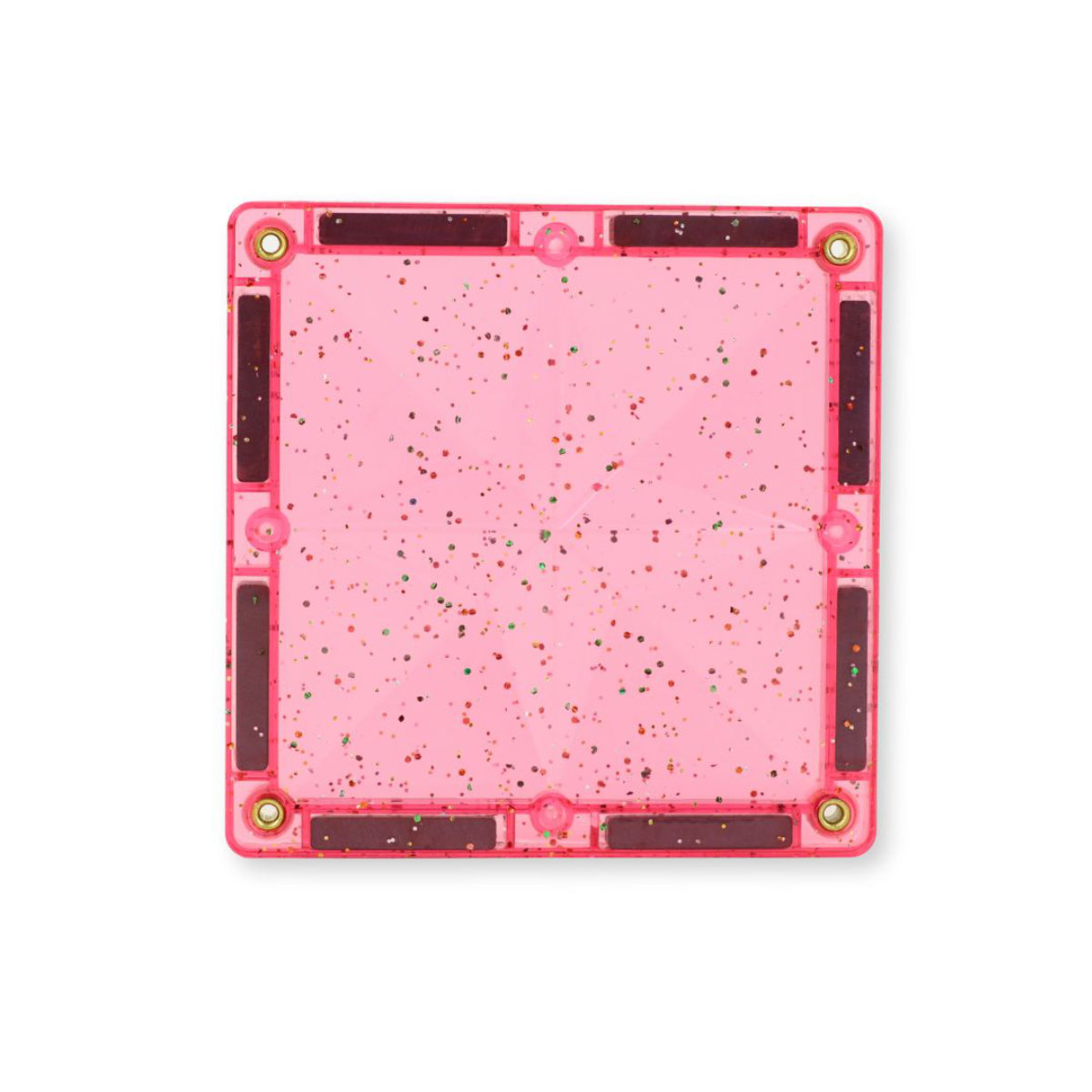 Das Cleverclixx Glitter Tiles Pack Transparent/Rosa – 16 Teile ist die ideale Erweiterung, um Bauwerke mit funkelnden Highlights zu versehen und die Kreativität deines Kindes zum Strahlen zu bringen.