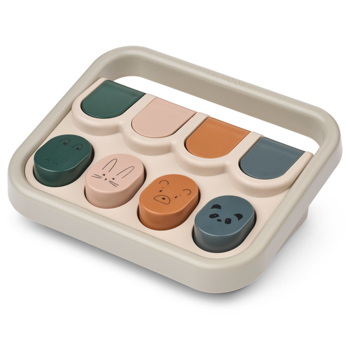 Das Liewood Aviva Pop-Up Spielzeug ist ein klassisches Motorikspielzeug, das Kinder spielerisch zum Entdecken einlädt. Durch das Drücken der großen Knöpfe erscheinen nacheinander vier lustige Tierfiguren.