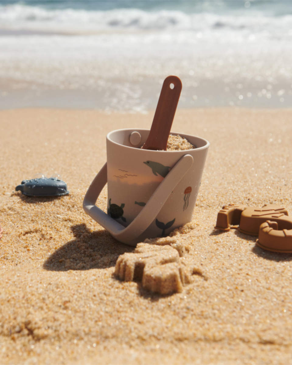 Das Set enthält einen weichen Silikon-Eimer, eine Schaufel und vier passende Sandförmchen. Dadurch können Kinder ihre eigenen kleinen Bauwerke im Sand erschaffen – egal ob am Meer, im Garten oder beim Spielen am Pool.